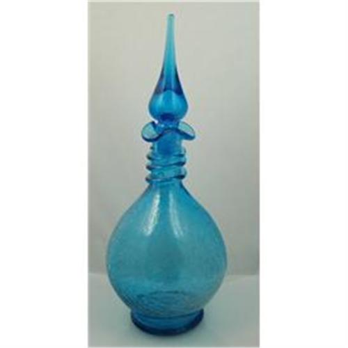 Beautiful Rainbow Glass Company crackle glass decanter from West Virginia, Ca. 1950's - 1960's. It is 15" tall to the top of the stopper. The original stopper is a solid tear-drop stopper that alone measures 6 1/4". The decanter has very fine crackling and the pour spout is tri-fold and rolled rim edge and very smooth. The neck has a snake-like hand-applied rigaree. There is no damage to the decanter. The entire decanter was hand blown. Sharp pontil mark on the bottom.