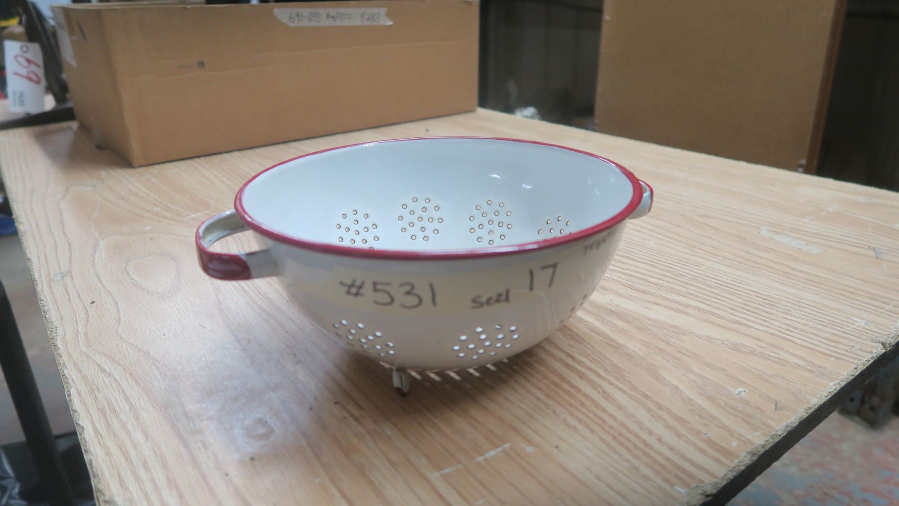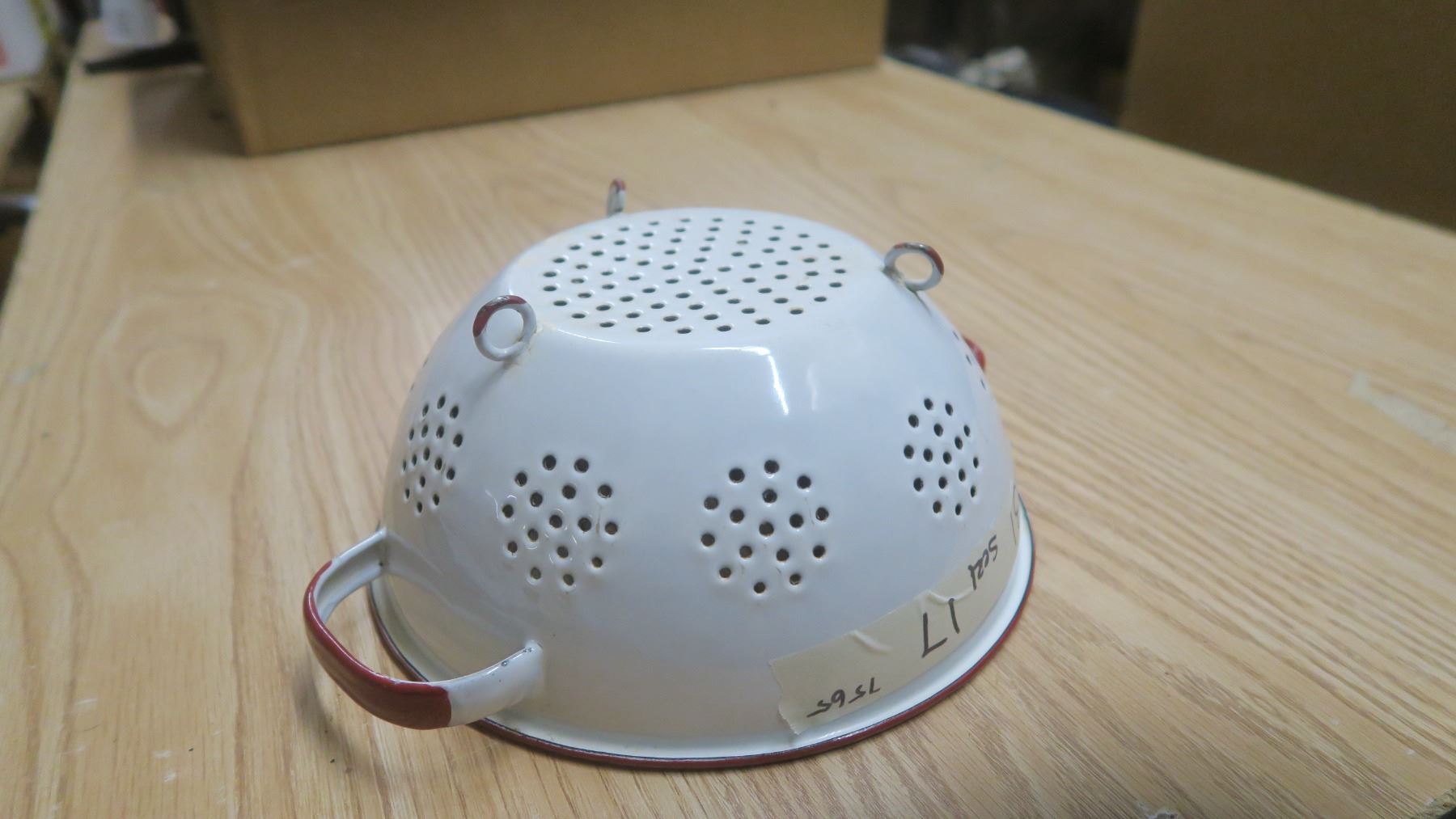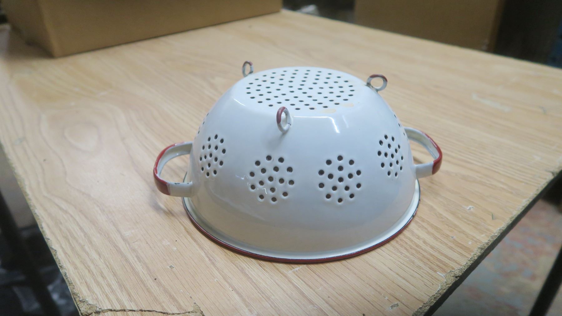 red & white vintage enamelware strainer