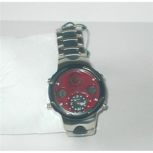 This is a gent red face driver watch with a stainless steel back. The watch is water resistance and has an alarm with a light. This is a heavy watch