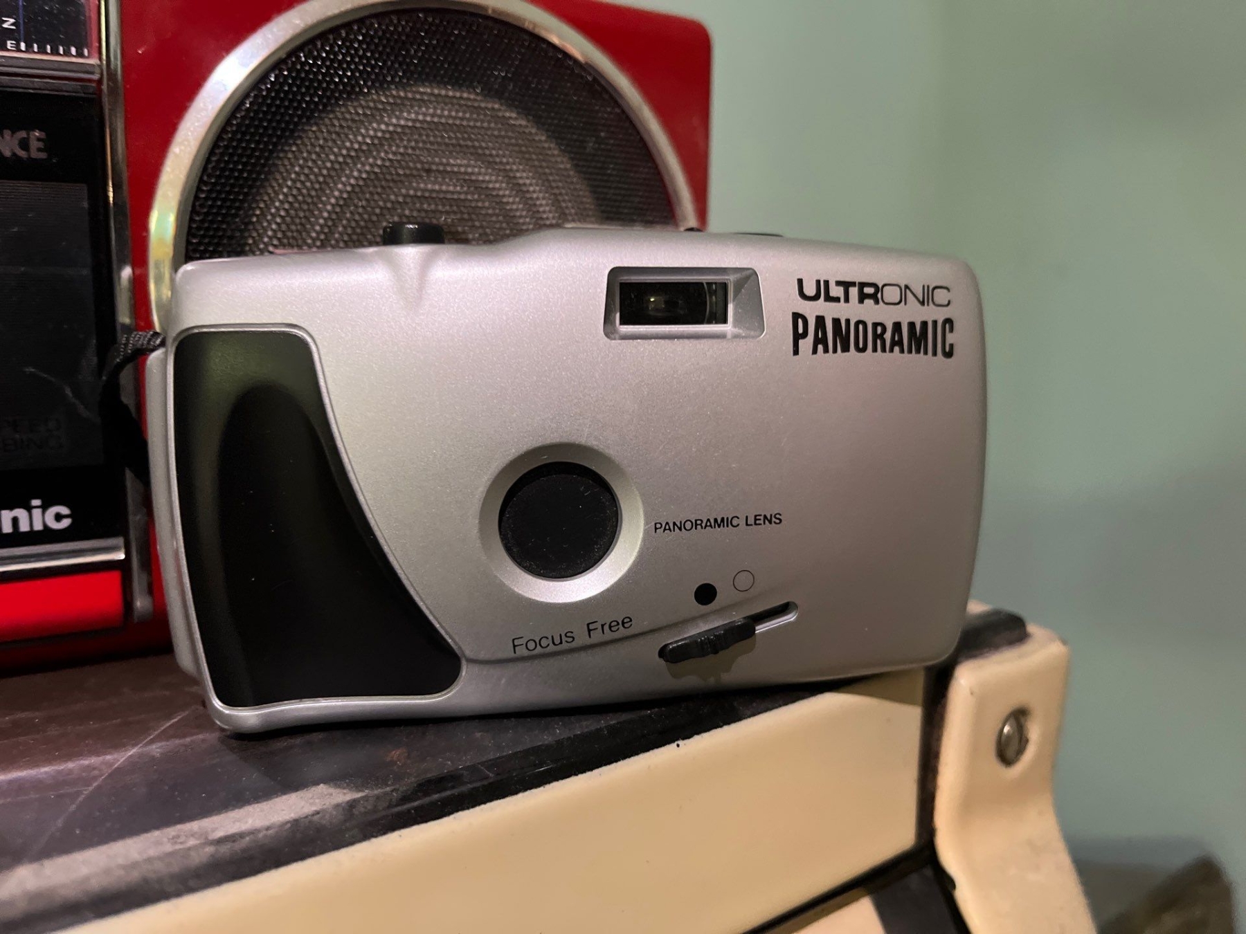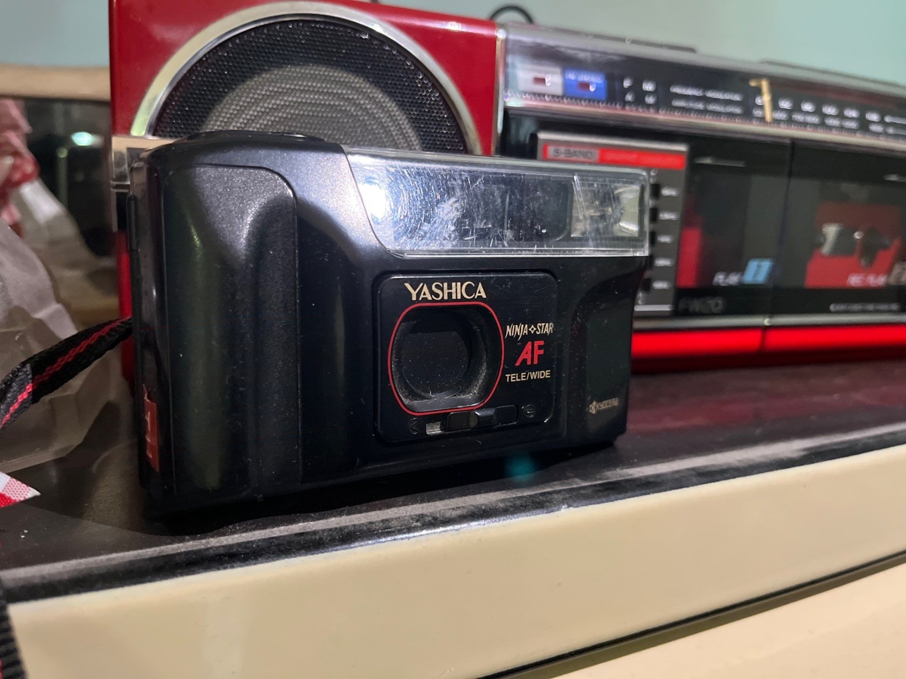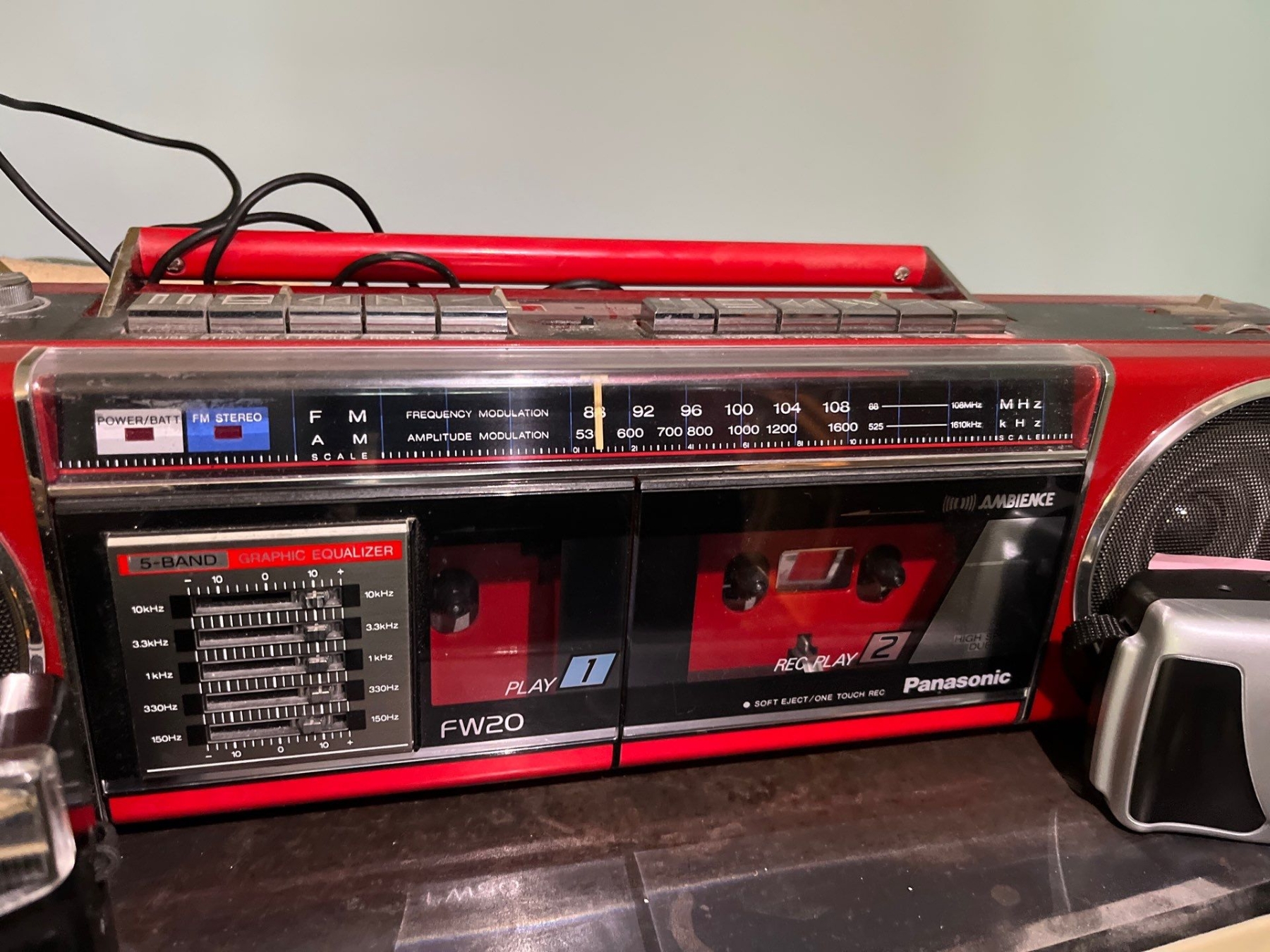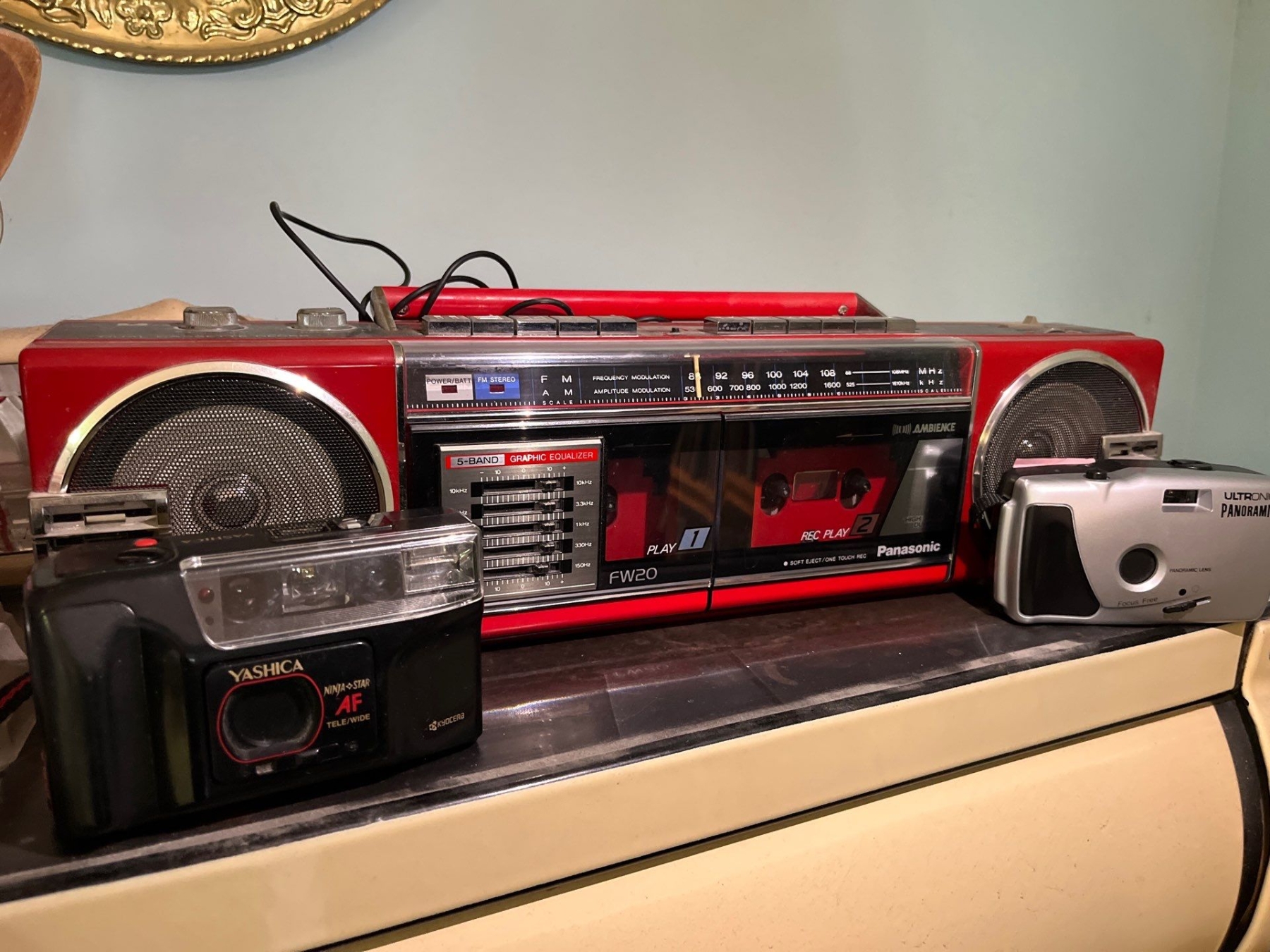 retro Panasonic recordable red ghetto blaster with two film cameras