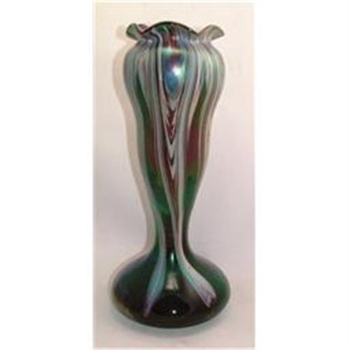 Rindskopf Vase with multi-colored pulled feathers that go from the top to almost the bottom. This vase is hand blown with a large polished pontil, and inside the polished pontil, they left the pontil mark. There is no damage to this vase. There are a few small bubble burst which is typical in art glass. The top is multi-rolled and aesthetically beautiful. The rim is rolled and fire polished smooth. The vase color is an irridescent green color. The vase is 13 1/4" tall. The base is 5 1/2" across.