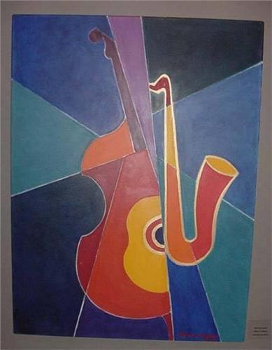 Peter Squicciarini is a native New Yorker with studios in Punta Gorda, Florida and Norfolk, Virginia. He has studied at the Art Students League of New York and is now an elected and voting member of the League. He has had solo shows at the Manhattan Soho Gallery of Adelphi University in New York City, the Arts and Humanities Council Gallery and the Moss Gallery in Port Charlotte, Florida and the Goff Gallery at the Visual Arts Center in Punta Gorda, Florida. Squicciarini's paintings are in corporate collections in Washington, D.C., Adelphi University, Garden City, New York and in private collections. He is represented by the Jain Gallery at 24 W. 57th Street in New York City.<BR>Rithum n' Blooz is a mixed media painting containing three musical instruments symbolic of the American popular music idiom of rhythm and blues, against a field of several hues of the color blue.