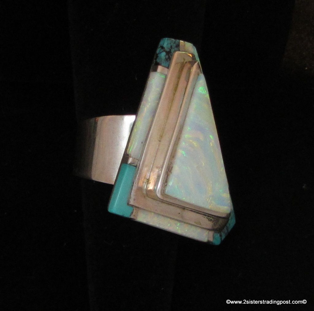 Size 7.5 opal triangle shaped ring has a very unique design. Precious opal and turquoise inlay make up the first layer of this ring. Setting atop the inlay is a sterling mount that holds a triangle piece of precious opal that measures 20.7 mm x 14 mm. This beautiful piece of precious opal flashes iridescent colors when viewed in different light from any direction. The overall ring measures 28.9 mm x 25.2 mm and weighs 12.4 g, band width is 12.2 mm near the ring crown and 6.7 mm on the back of the band. Ring is stamped rn, is not stamped sterling NOTE: piece has been tested and is silver.