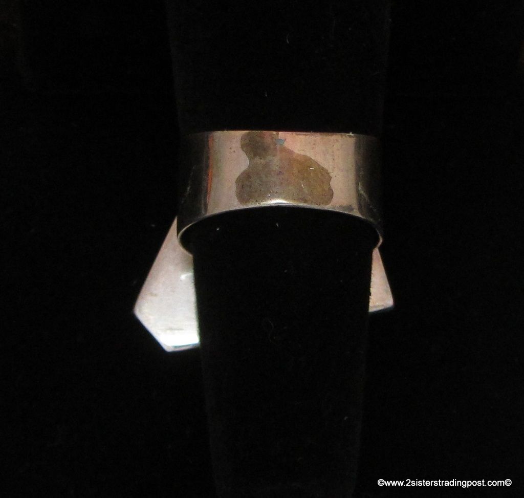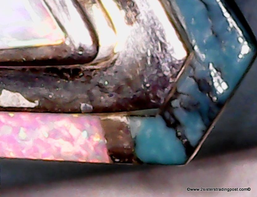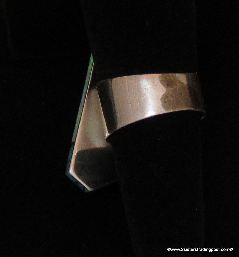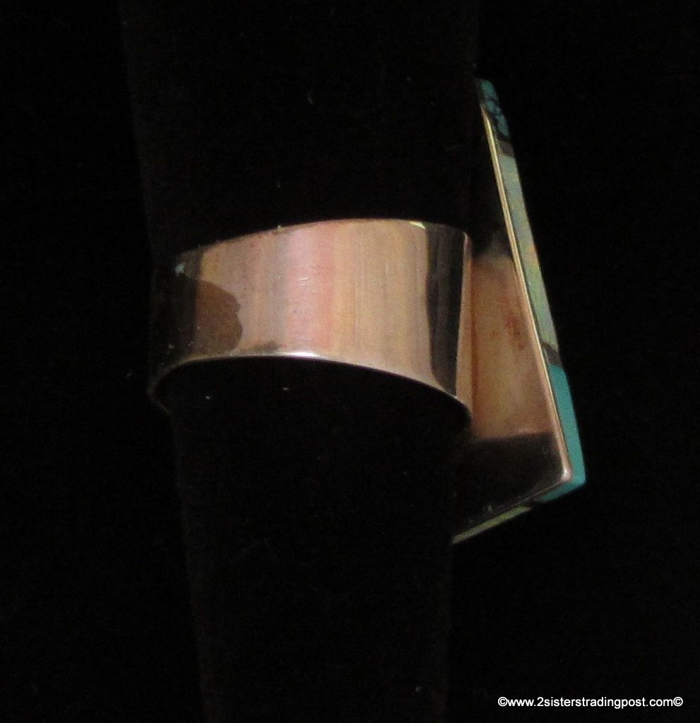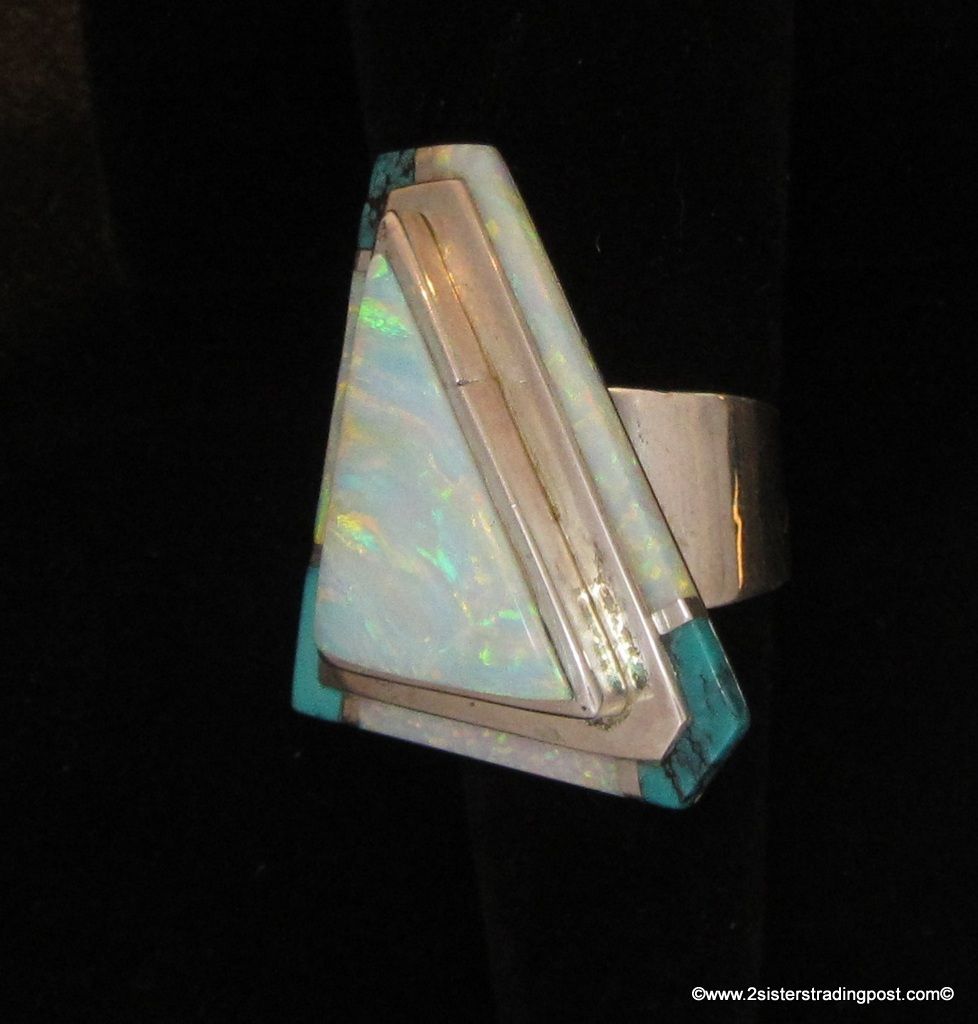 Size 7.5 opal triangle shaped ring has a very unique design. Precious opal and turquoise inlay make up the first layer of this ring. Setting atop the inlay is a sterling mount that holds a triangle piece of precious opal that measures 20.7 mm x 14 mm. This beautiful piece of precious opal flashes iridescent colors when viewed in different light from any direction. The overall ring measures 28.9 mm x 25.2 mm and weighs 12.4 g, band width is 12.2 mm near the ring crown and 6.7 mm on the back of the band. Ring is stamped rn, is not stamped sterling NOTE: piece has been tested and is silver.