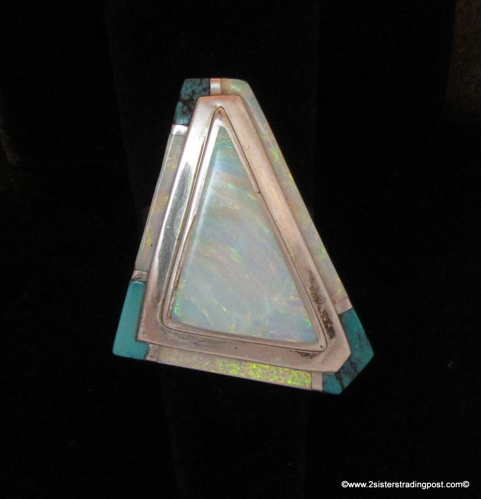Size 7.5 opal triangle shaped ring has a very unique design. Precious opal and turquoise inlay make up the first layer of this ring. Setting atop the inlay is a sterling mount that holds a triangle piece of precious opal that measures 20.7 mm x 14 mm. This beautiful piece of precious opal flashes iridescent colors when viewed in different light from any direction. The overall ring measures 28.9 mm x 25.2 mm and weighs 12.4 g, band width is 12.2 mm near the ring crown and 6.7 mm on the back of the band. Ring is stamped rn, is not stamped sterling NOTE: piece has been tested and is silver.