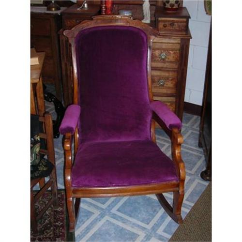 This is a rocking chair. The upolsthery was changed and chair was refinished. It is in good condition. Very comfortable, this is a lady rocking chair. It has a little carving on the top and composition of burled walnut.Please visit us on our website, we offer 20% off for a holiday season.