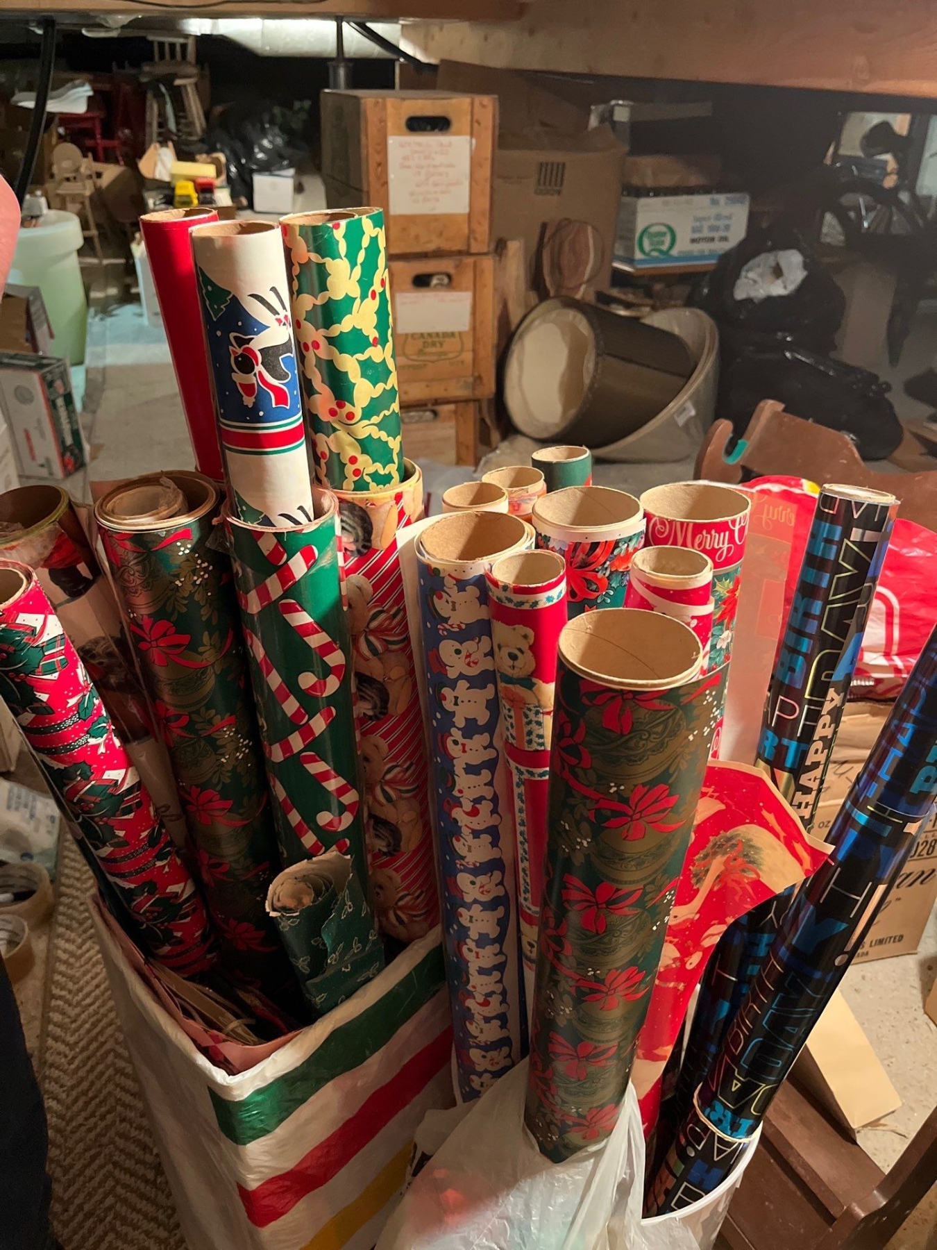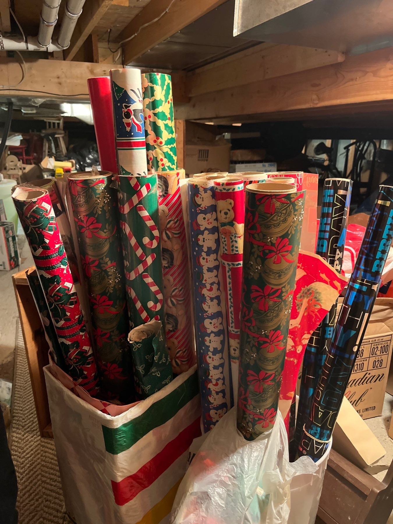 rolls and rolls and rolls of vintage wrapping paper. Get your 80s out . with a bag full of Christmas pillows.