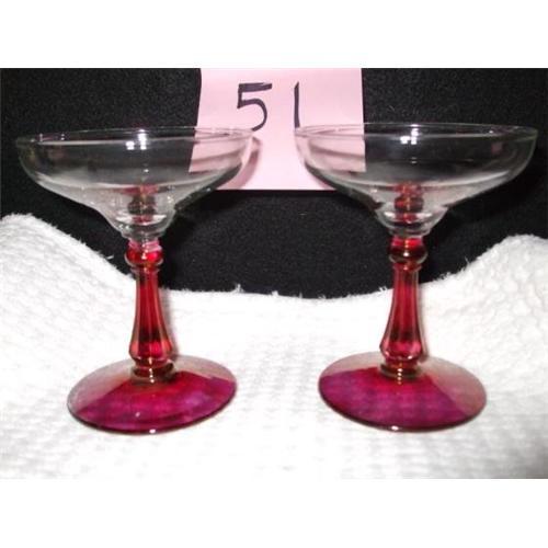 the stems and the round foot on these 2 champagne glass's are ruby red pressed glass with the bowl on the glass being clear ... the red on these 2 glasses are irridized ..has some wear to the color ,but still very elegant and romantic .. price is for 2, anchor hocking???insurance is included with shipping..