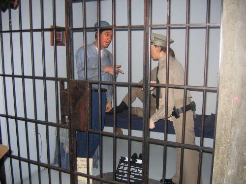 scene/set/props - jail bars, bench, table, lamp & photo