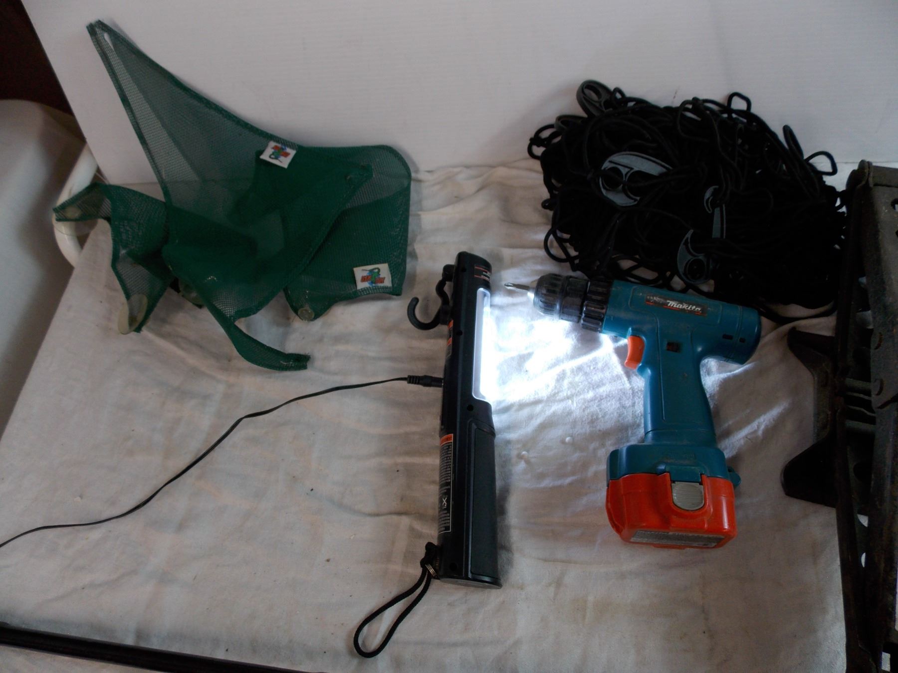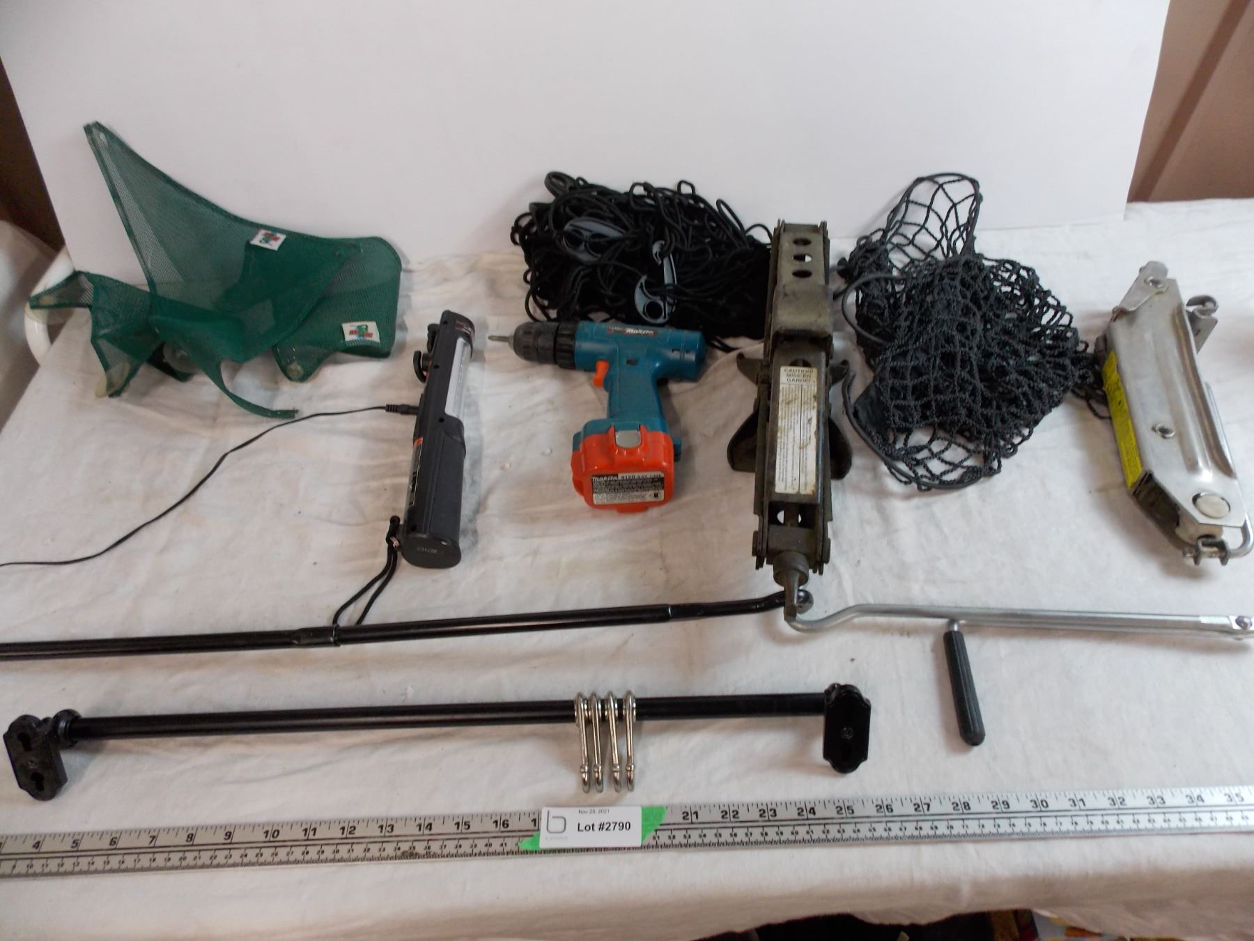 scissor jacks, trouble light, mesh netting, curtain rod, makita drill