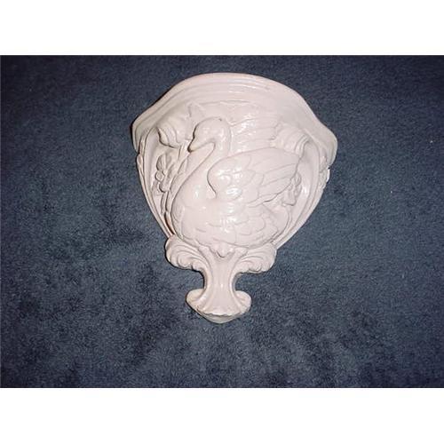 This plaster sconce has been painted white and is very attractive. It has a swan on the front, and many scrolls, flowers, and other designs. Image 4 shows the place of a small chip at the end of the sconce, which could be sanded and painted if you think that is necessary. The inside back is hollow and remains unpainted, as is necessary to allow for the plaster to breathe. A hook is embedded at each corner of the back for hanging purposes (see picture 3).