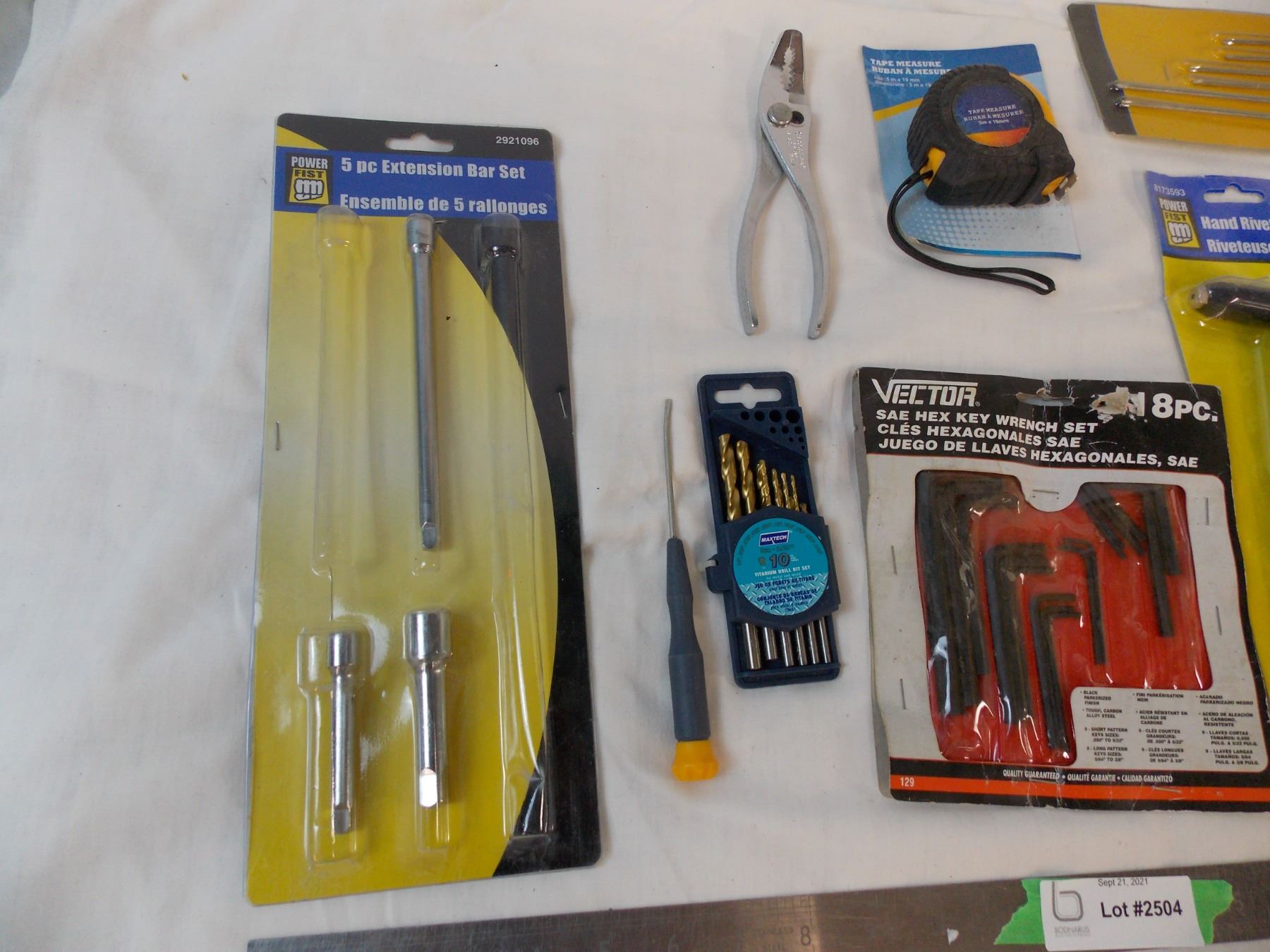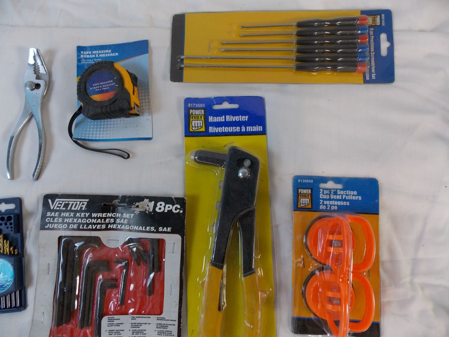 screwdriver set, riveter, 2pc suction + hex keys, drill bits, measuring tape
