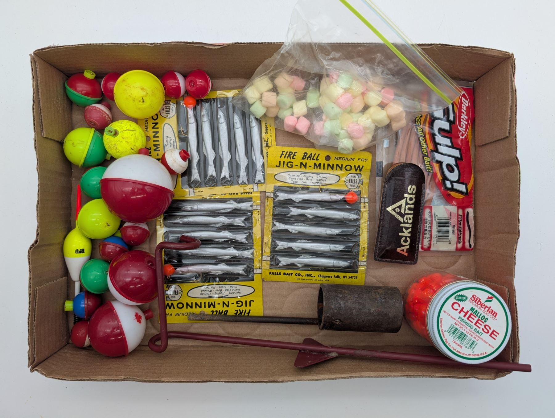 selection of bobbers, hooks, bait etc.