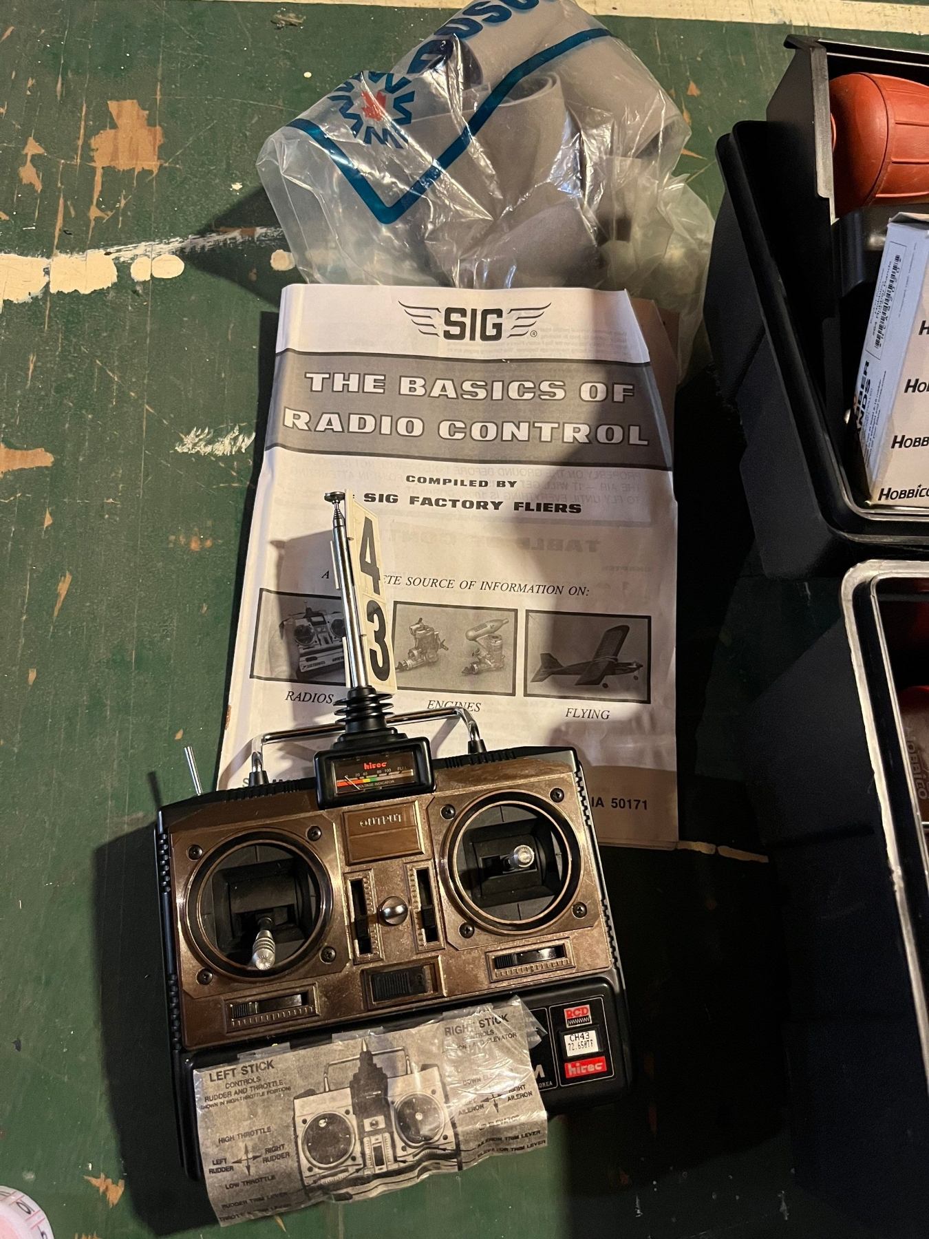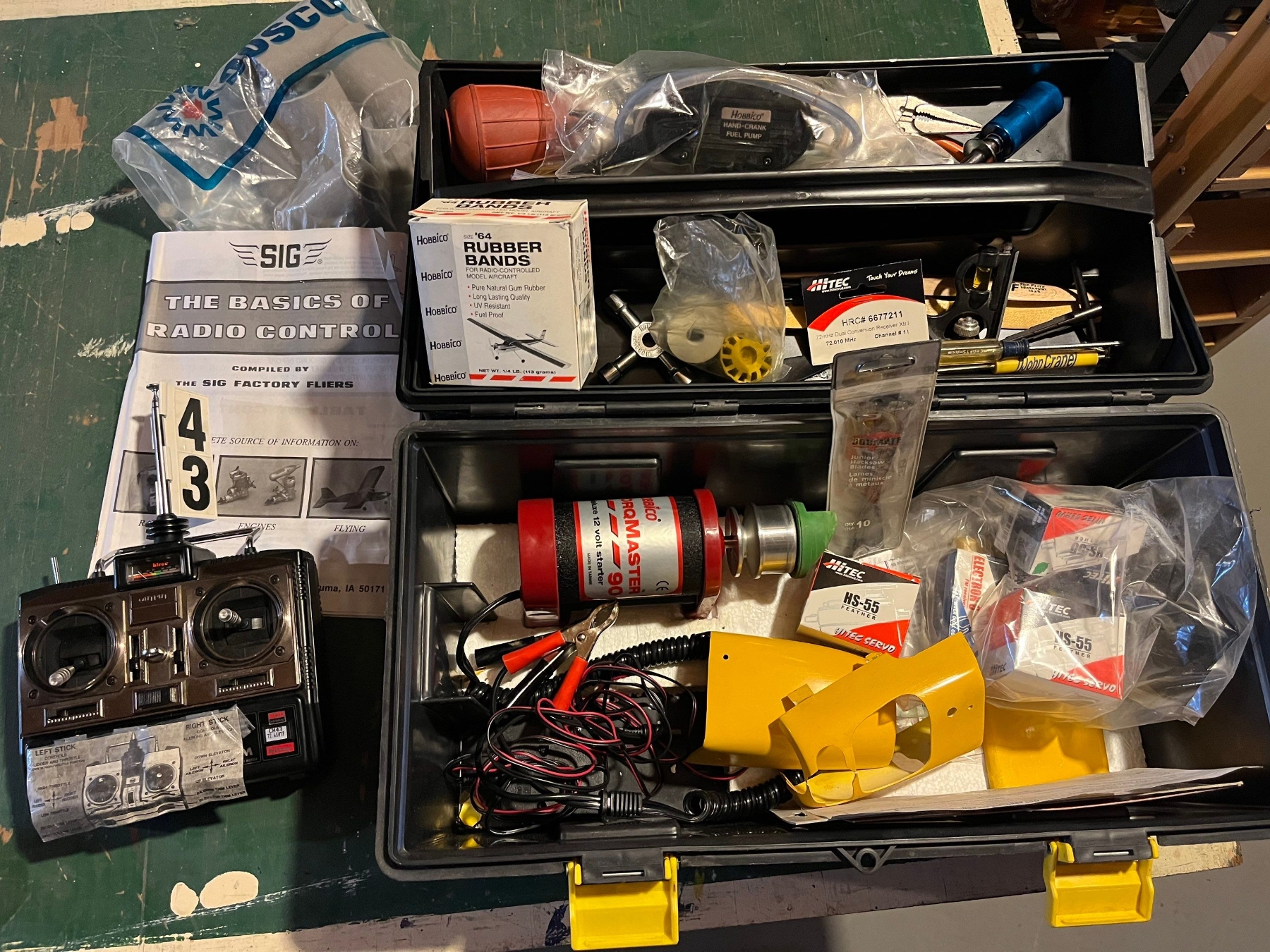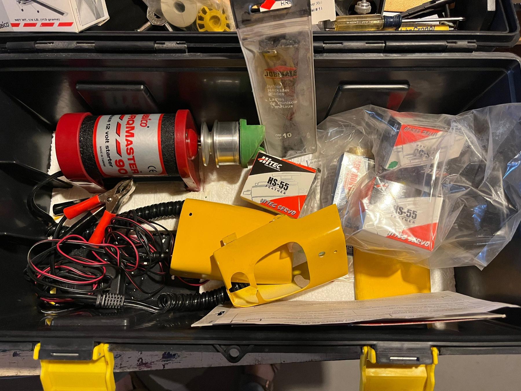 selection of miscellaneous Remote control, airplane parts, including a radio controller for high altitude if fueling pump extra blades, several other seals and starting systems for model airplanes