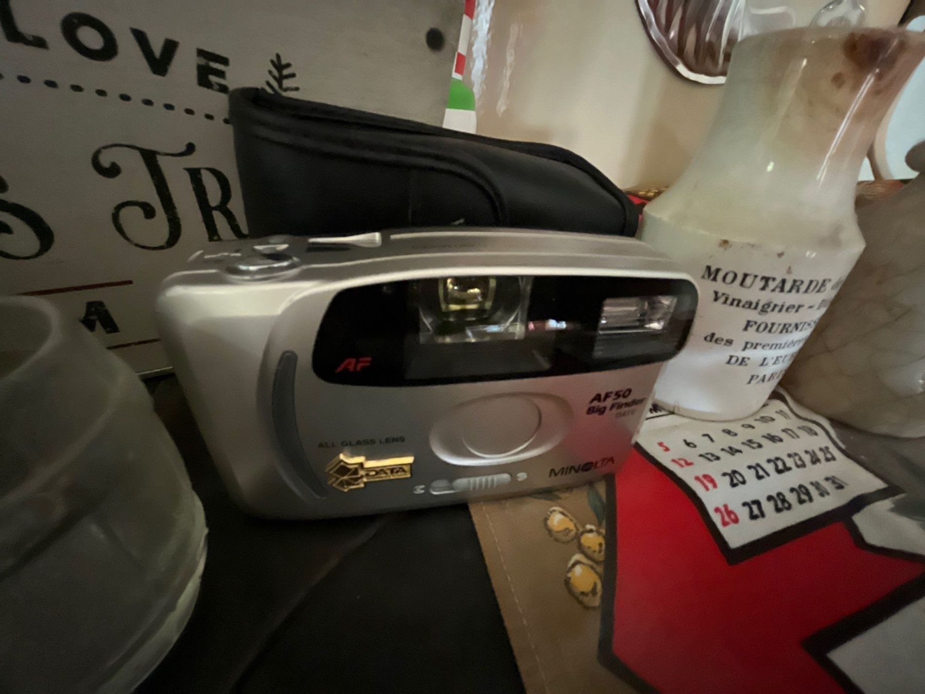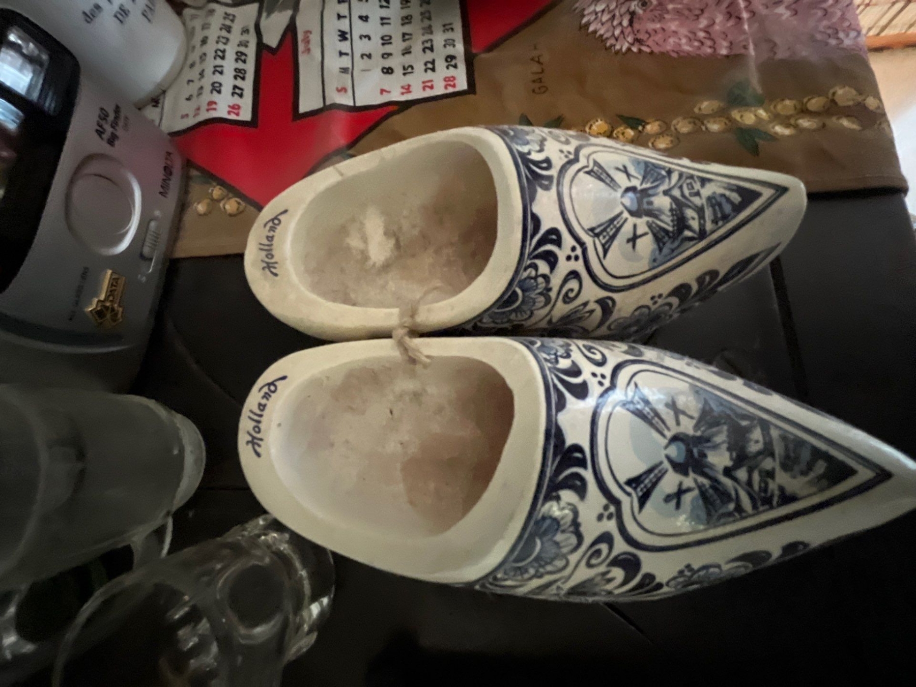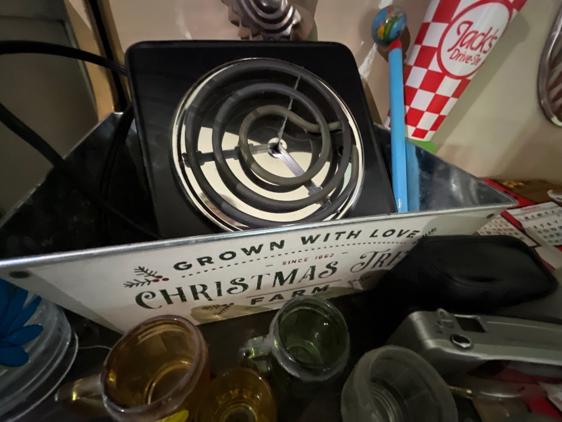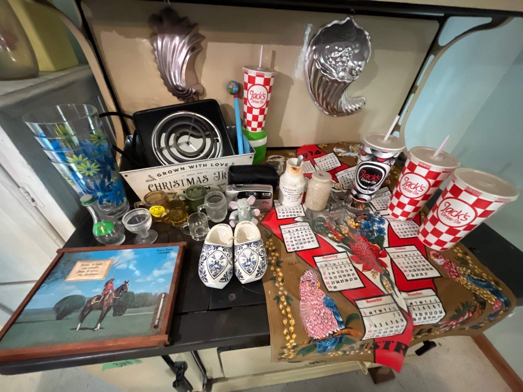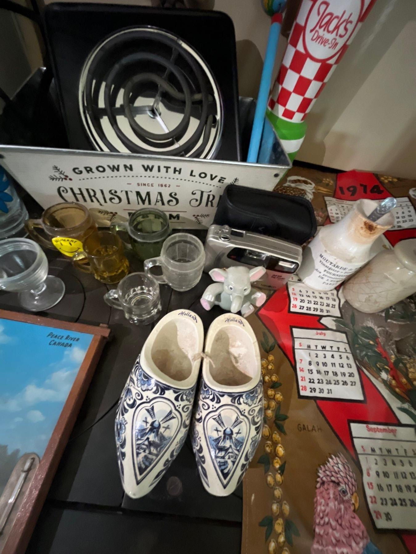 selection of miscellaneous items, including Jack’s original driving cups small pair of Dutch clogs, two small pieces of pottery, camera, electric burner, and some miscellaneous shot cups and plastic water cups