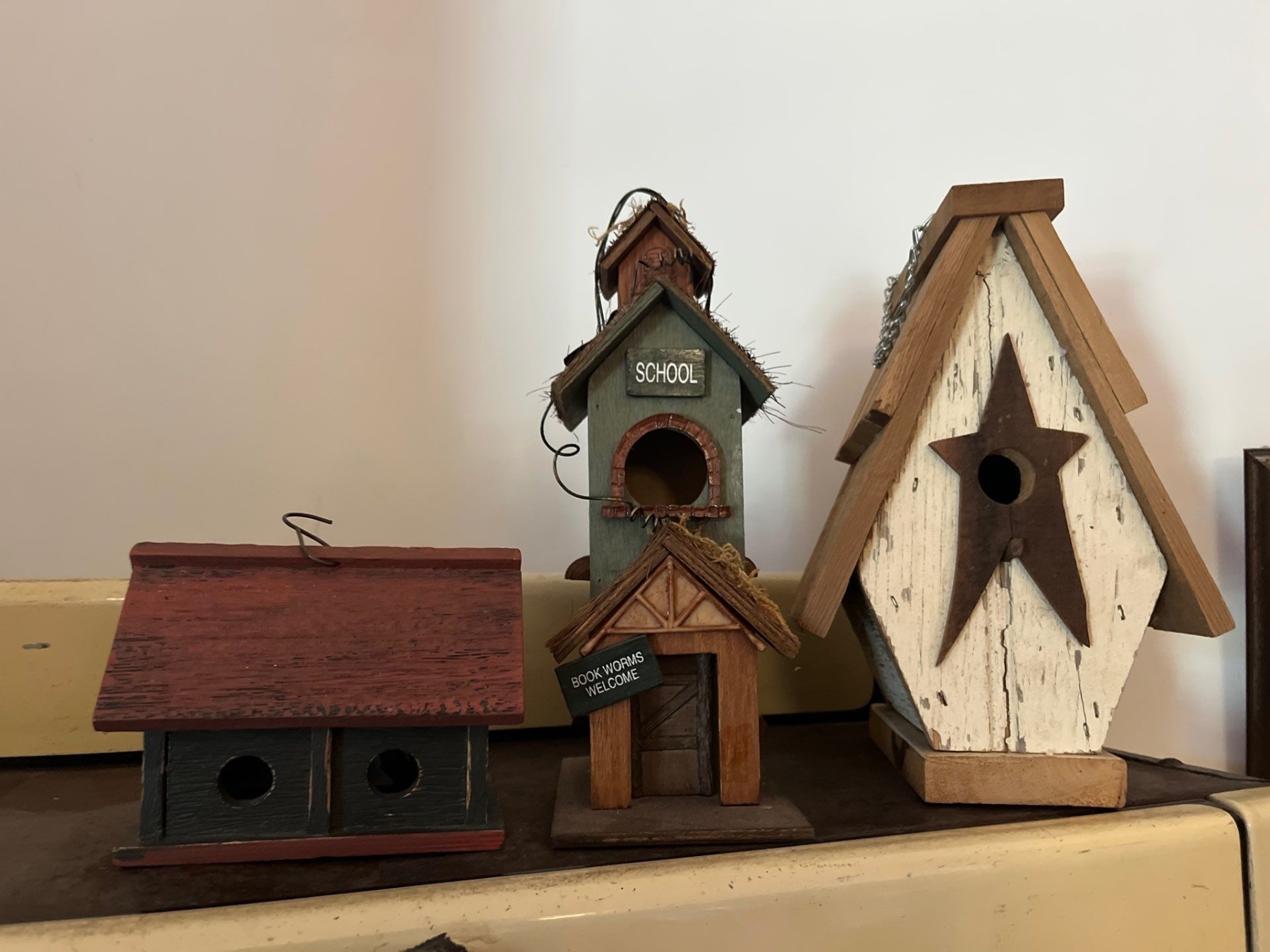 selection of three birdhouses, small, medium, and large all hand painted and had made some from old