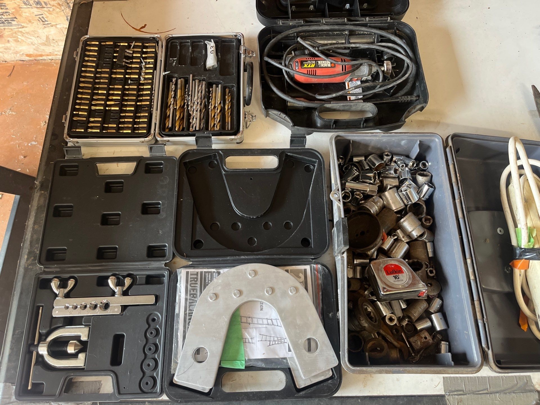 selection of tools, drill, bits, sockets router, and two hedge trimmers electric