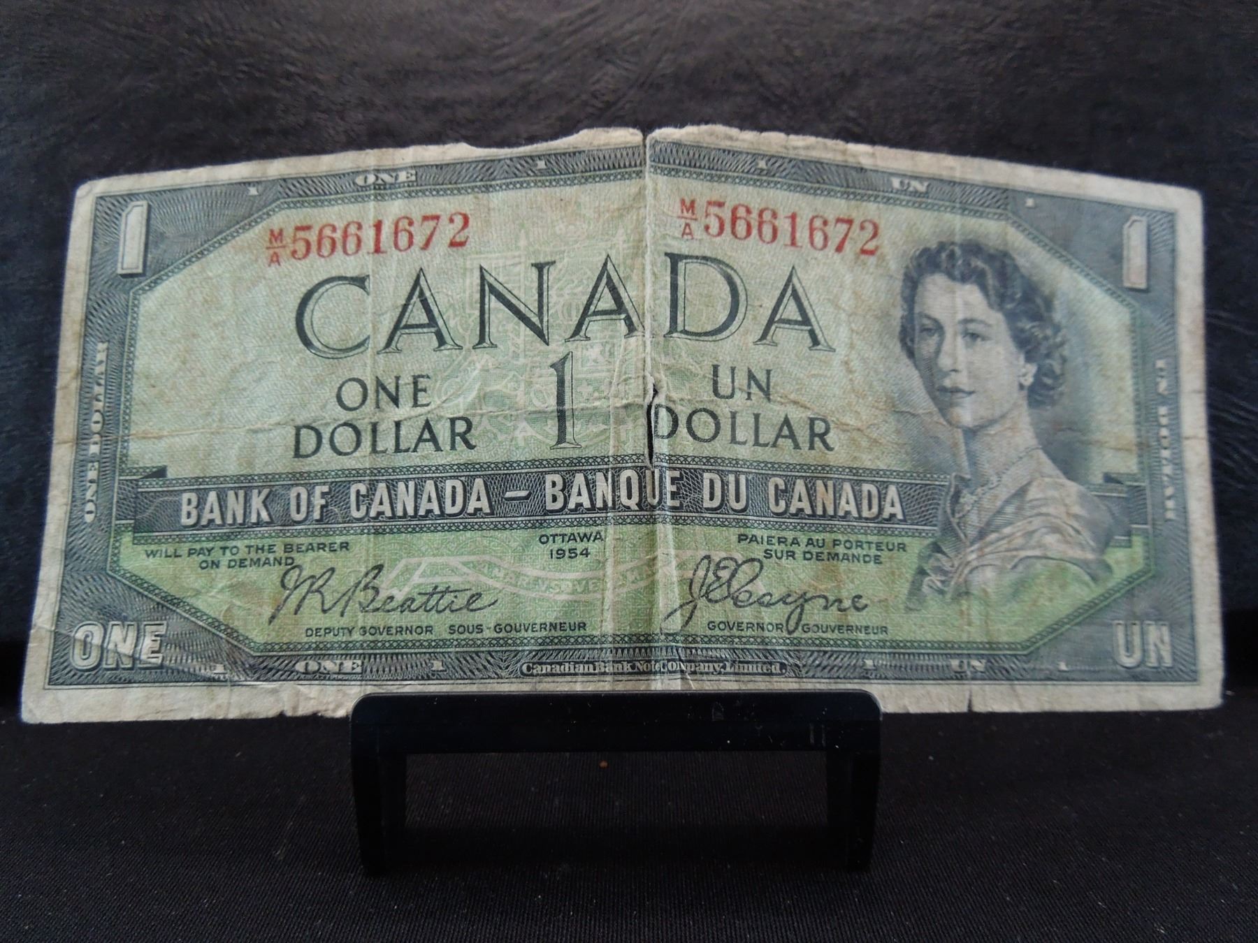 series of 1954 one dollar canadian bank note with the devil's face. This was an error in printing. The devil's face appears in the hair of queen elizabeth