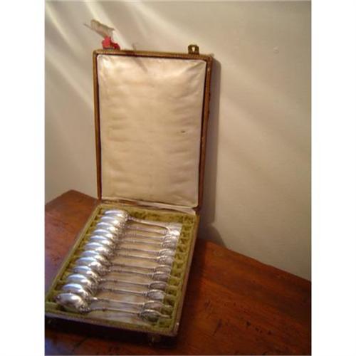 a set of 12 dessert spoon , silver , napoleon the third period . france . beautifull decor of flowers and bows . excellent investment . in thei box .