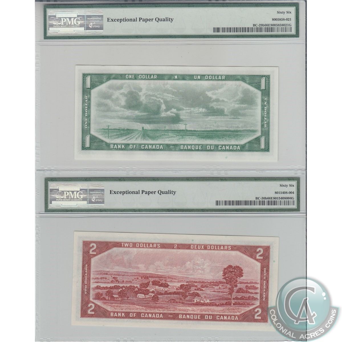 set of 2x 1954 Devil's Face banknotes both PMG Certified GEM UNC-66 EPQ! Receive a $1 and a $2 Denomination (BC-29b & BC-30b) both Beattie Coyne.