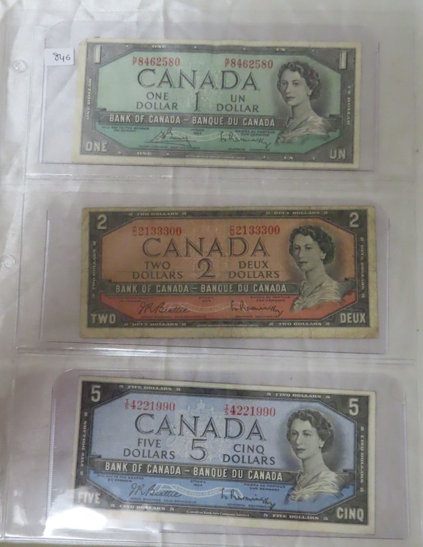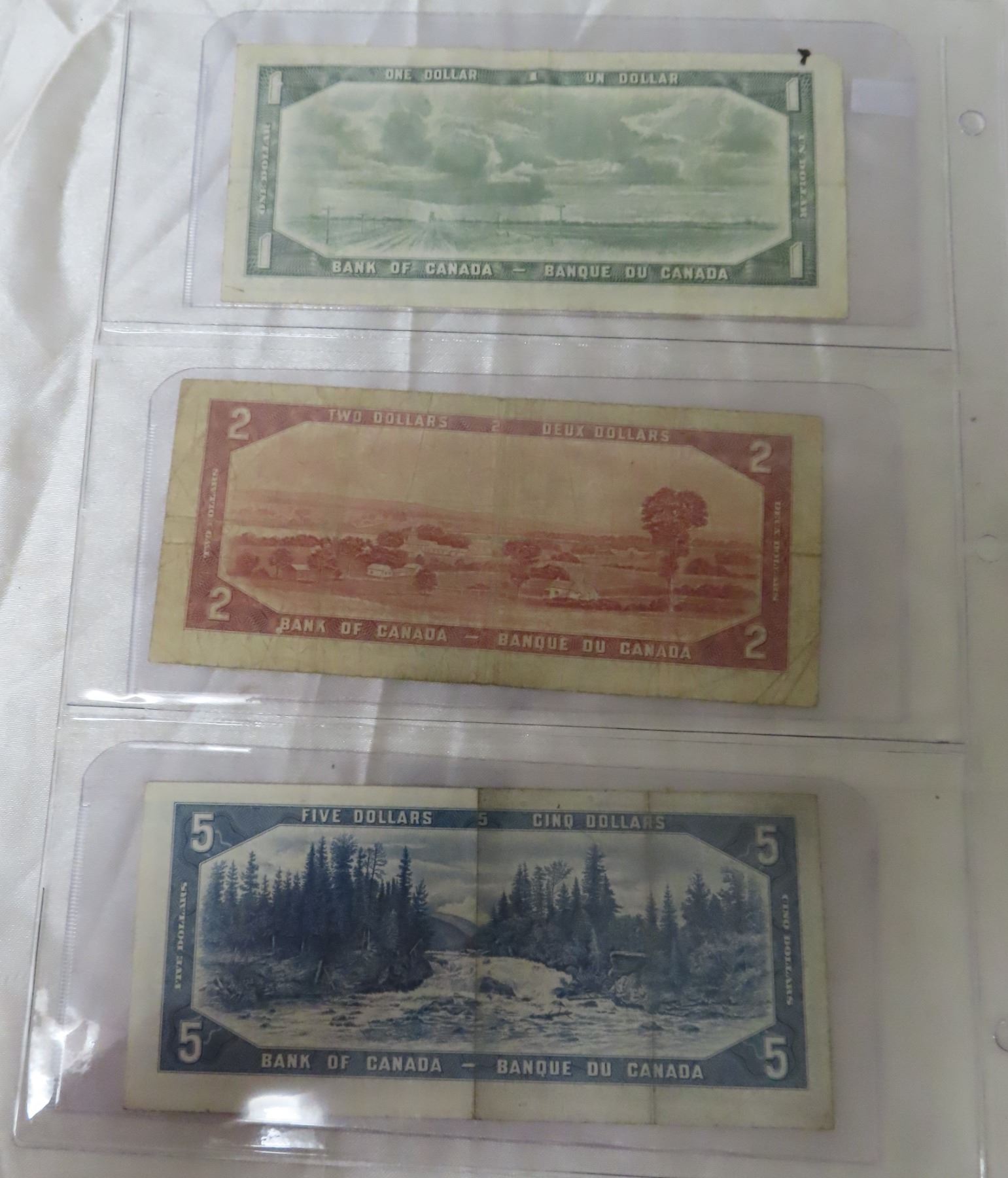 set of 3 1954 bank of canada bills ( $1, $2, $5)