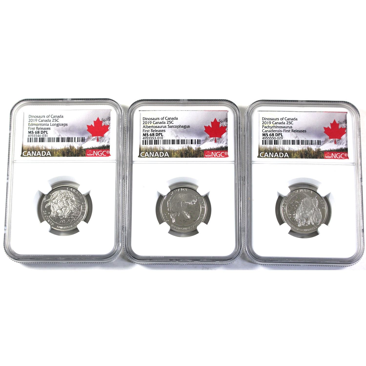set of 3x 20119 Dinosaurs of Canada 25-cent NGC Certified MS-68 DPL. You will receive the 2019 Pachyrhinosaurus Canadensis, 2019 Albertosaurus sarcophagus & 2019 Edmontonia Longiceps. 3pcs
