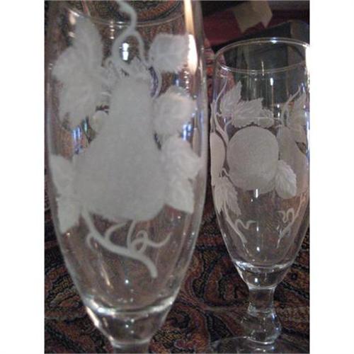lovely set of 6 wine glasses that are small in size but perfectly detailled in hand etching of fruits on the outside. From Italy, these 6 glasses are used for small table wines served at small cafes. Each glass is different in design. the price offered is for all 6.