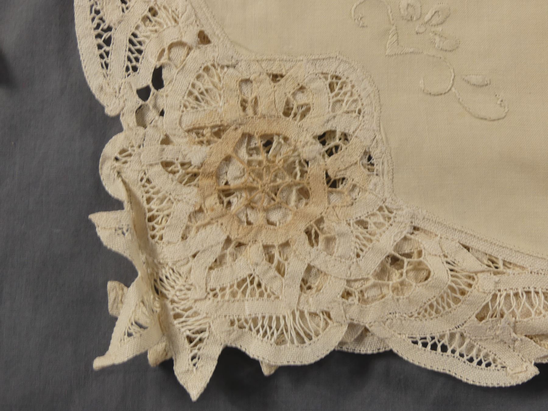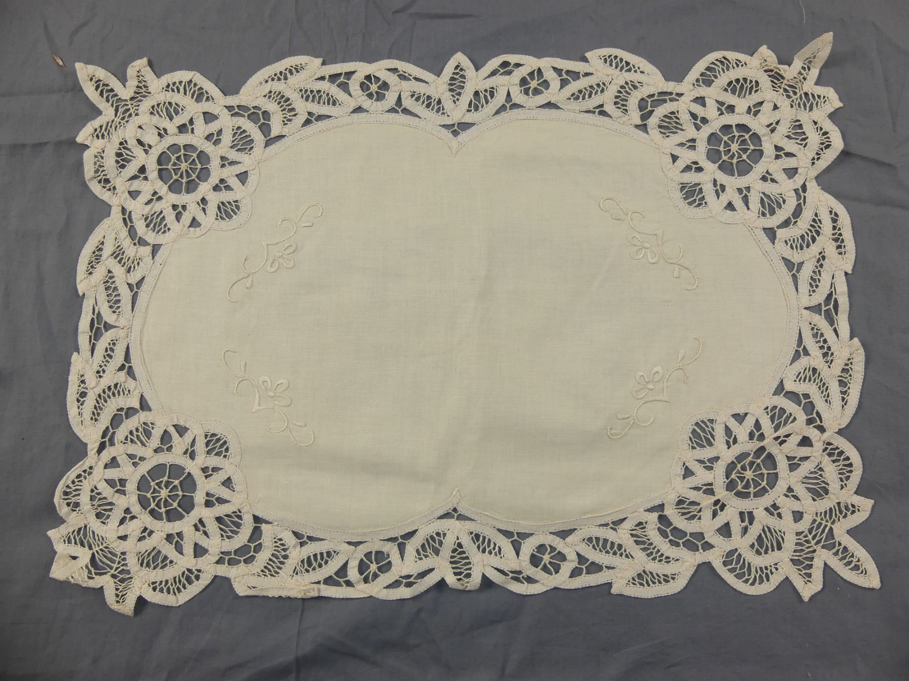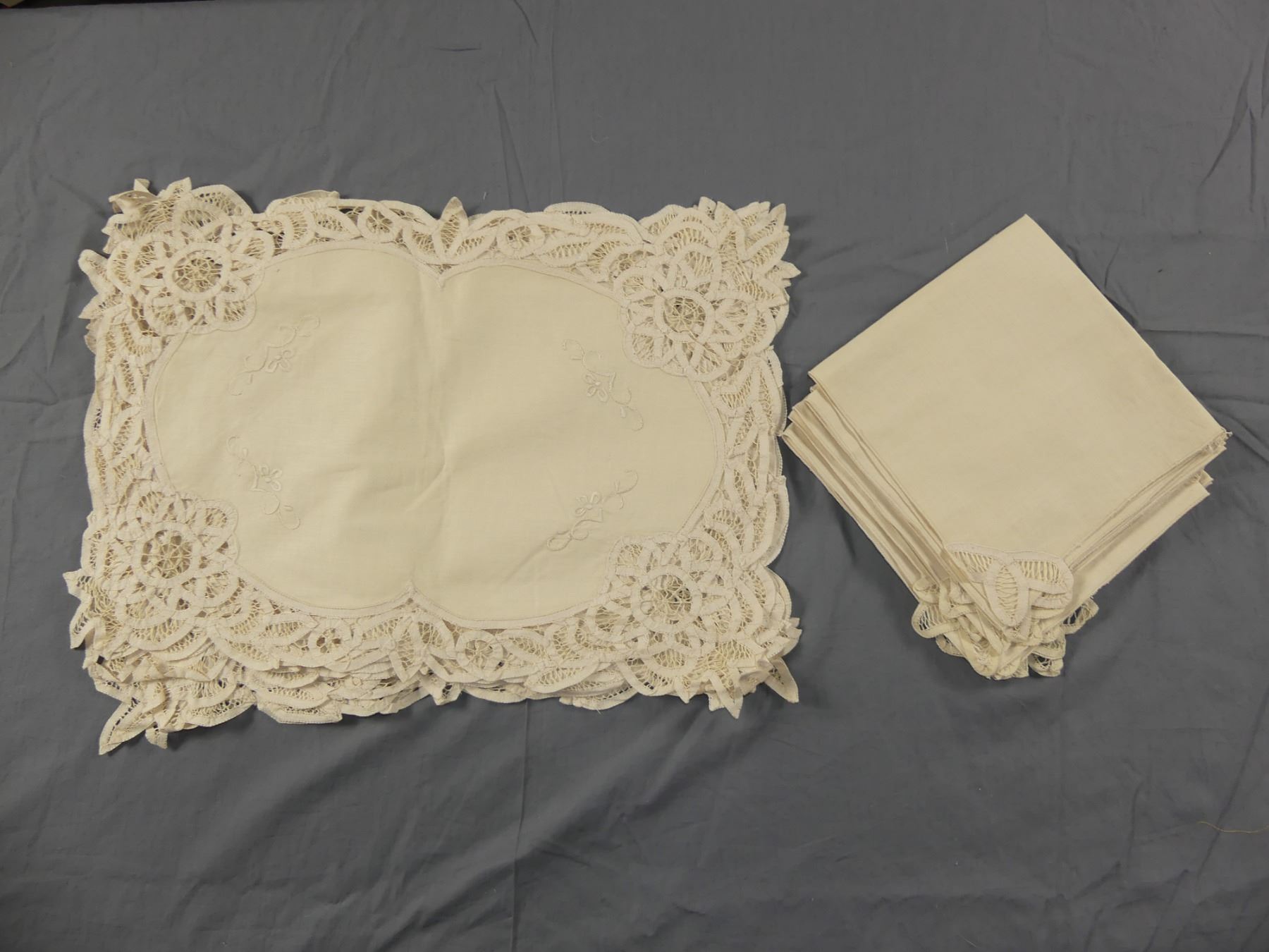 set of 7 Vintage Ecru Linen Tape Lace & Embroidered Placemat Set with