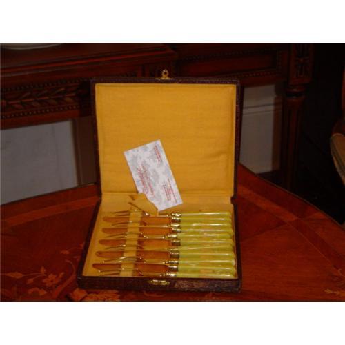 set of 11 forks and knives , beautifull marbled yellow bakelite and vermeil in their original box .