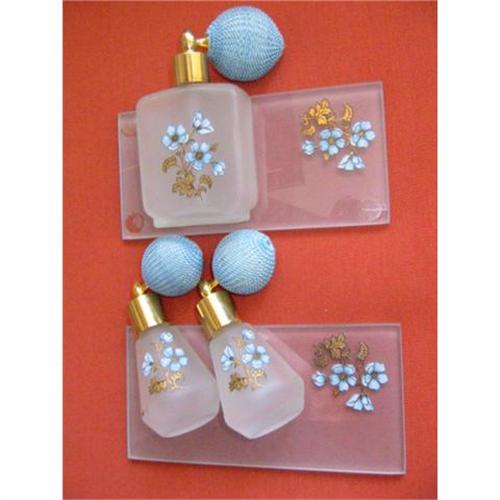 this lovely set is soft blue with gold accent. it is french style and has 5 pieces. will be a great display on your vanity or in the guest bathroom with favorite perfume.. the bottles are refillable and they are in excellent shape and conditions. they are vintage with normal wear and tear. no crack, crackle or chips. no tear in the blue wowen pump. they have nice brass tops . they measures 4 inches tall or an inch smaller. they are have the same theme. blue with gold accent. they are very decorative and collectible.