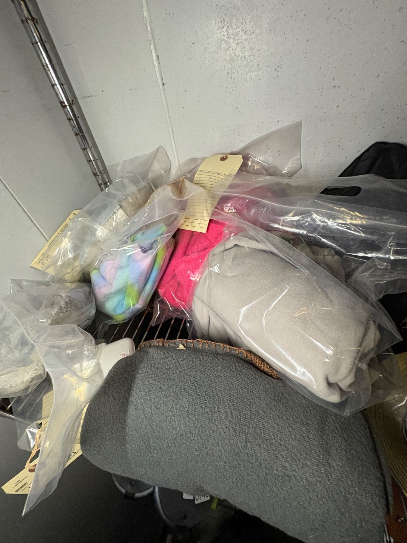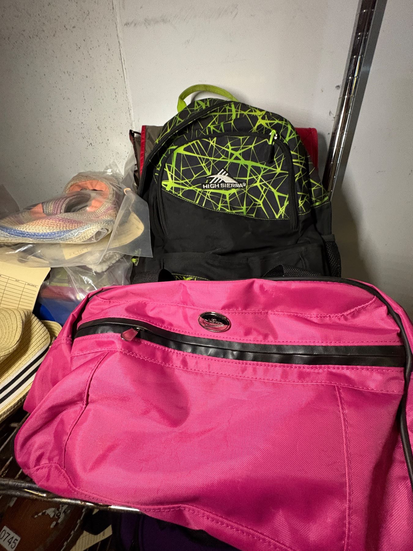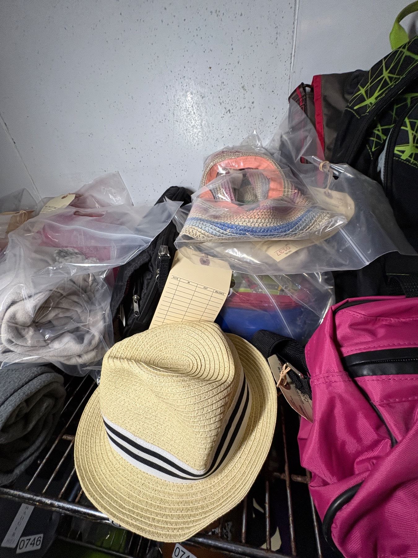 shelf full of assorted items- includes bags, hats, blankets, etc