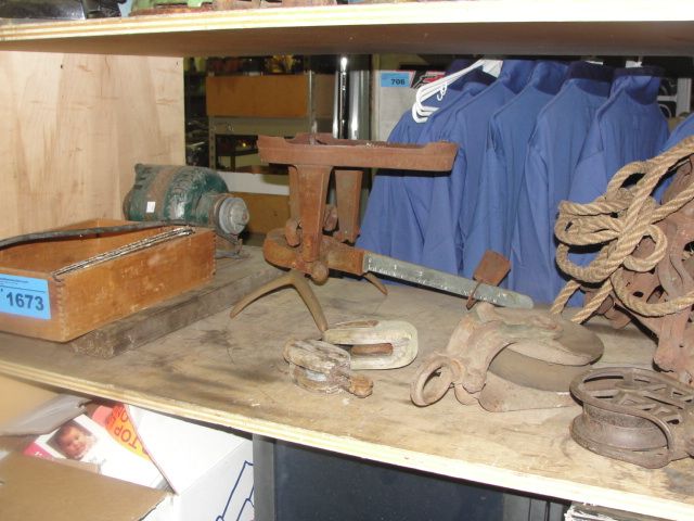 shelf lot of misc vintage rustic tools, blocks, ec