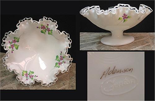 signed Fenton silver crest compote, hand painted with violets and signed by the artist. Stands 4" tall and measures 8" across. No chips or cracks