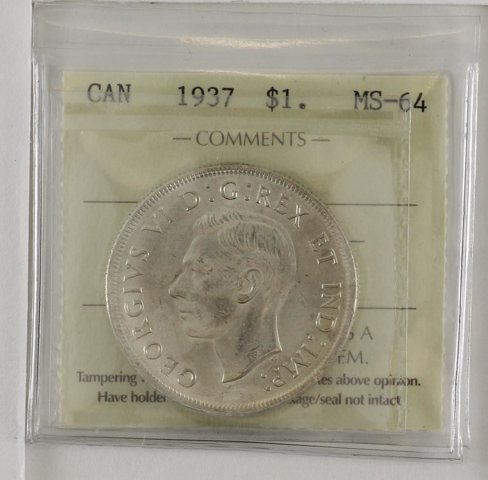 silver $1 1937 ICCS MS64. Bright coin with attractive lustre.