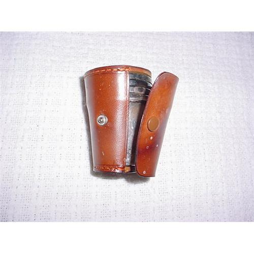 Four lovely silver shot holders, with a real leather case to hold them. On the bottom side of each holder is engraved "alpaka". All in good condition. The leather case has a design on it or is a liquid stain. It is hard to tell. Nevertheless, a great addition to your holiday gift list.