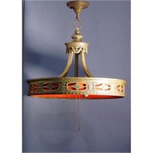 Ciorca 1920 silverpalted bronze three light ring chandelier with red fabrik shade.Height 22" diameter 221/2".