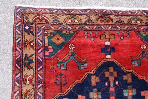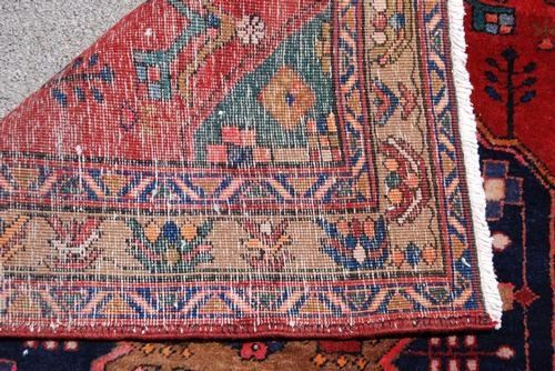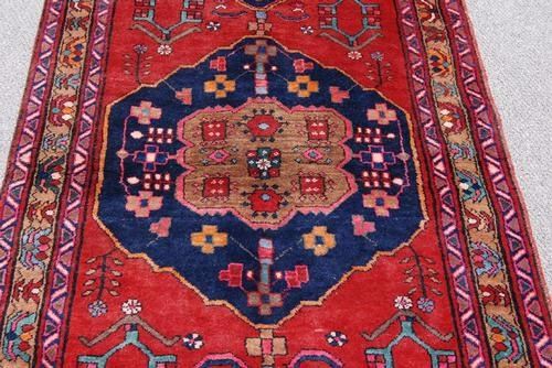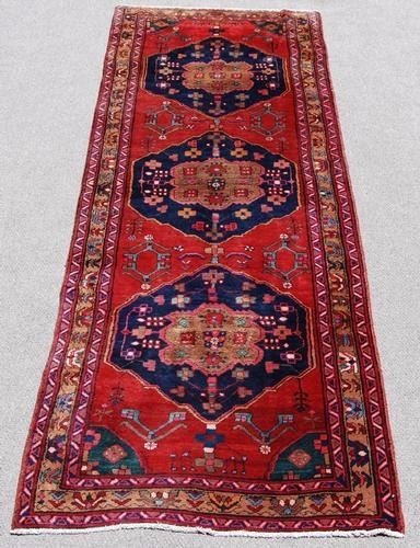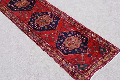 simply beautiful fine quality persian heriz runner, size 3.10 x 11.3 feet, made of fine quality baby lambs wool pile on cotton foundation, all natural vegetable dye, incorporating a center row of large centerpiece medallions on a rich red background and contrasted beautfiully with an intricately done floral border. hand woven in heriz, iran.