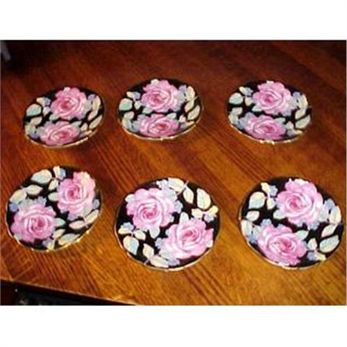 This is a pretty set of six demi sized saucers made by Paragon of England. They are signed with two castle crests "By appointment to H. R.The Queen & H. M. Queen Mary " Fine Bone China England There are also hash marks that appear to be 97732T. Paragon was known for it's fine quality china and artistic merits. This set features pink roses on black backround with blue cornflowers and multi pale green and yellow leaves.Some of the gold trim is missing. I have used them on my afternoon tea table for many years as teabag disposal holders. They could also be nut or candy dishes. The Queen Mary refers to the Mother of Queen Elizabeth's Father.