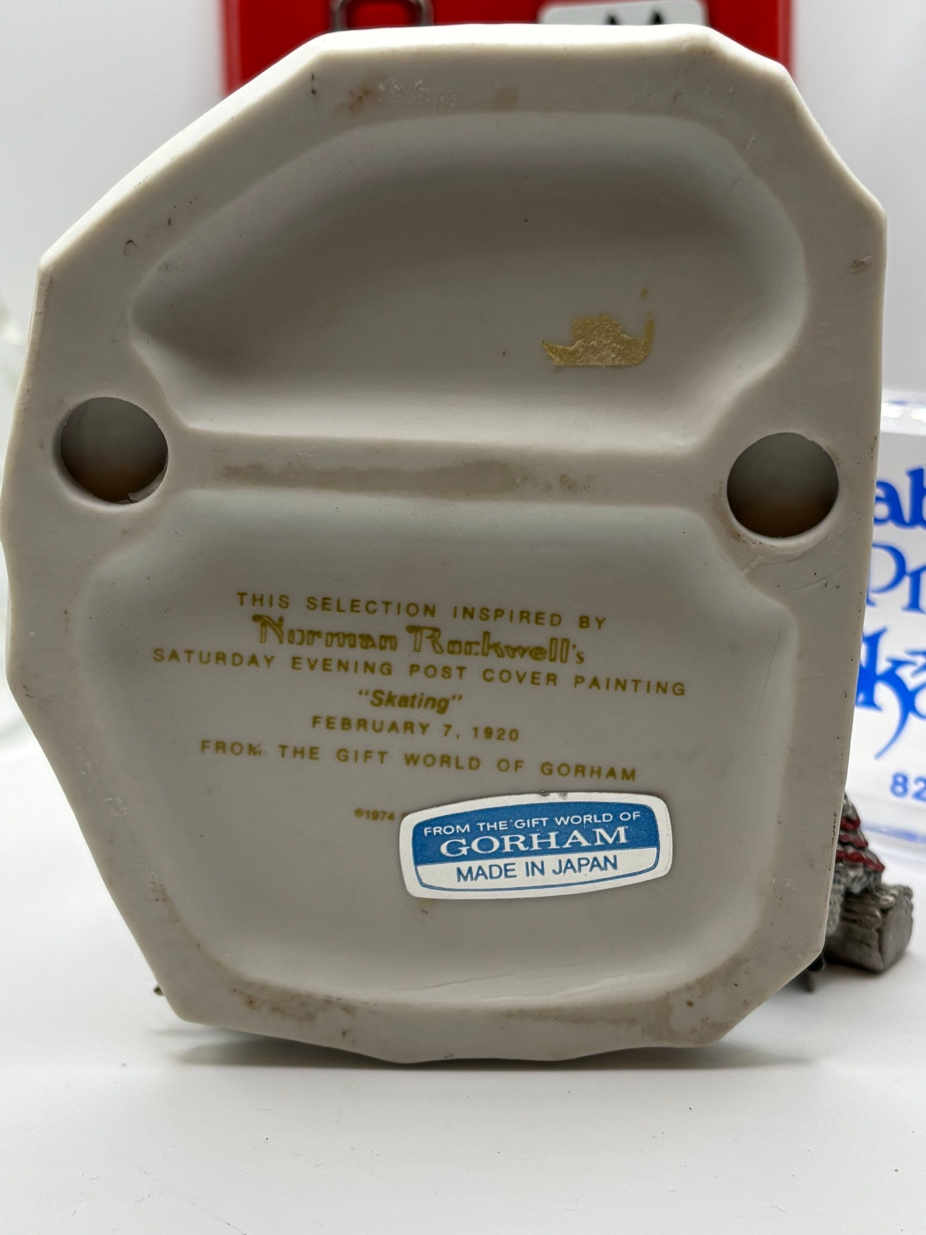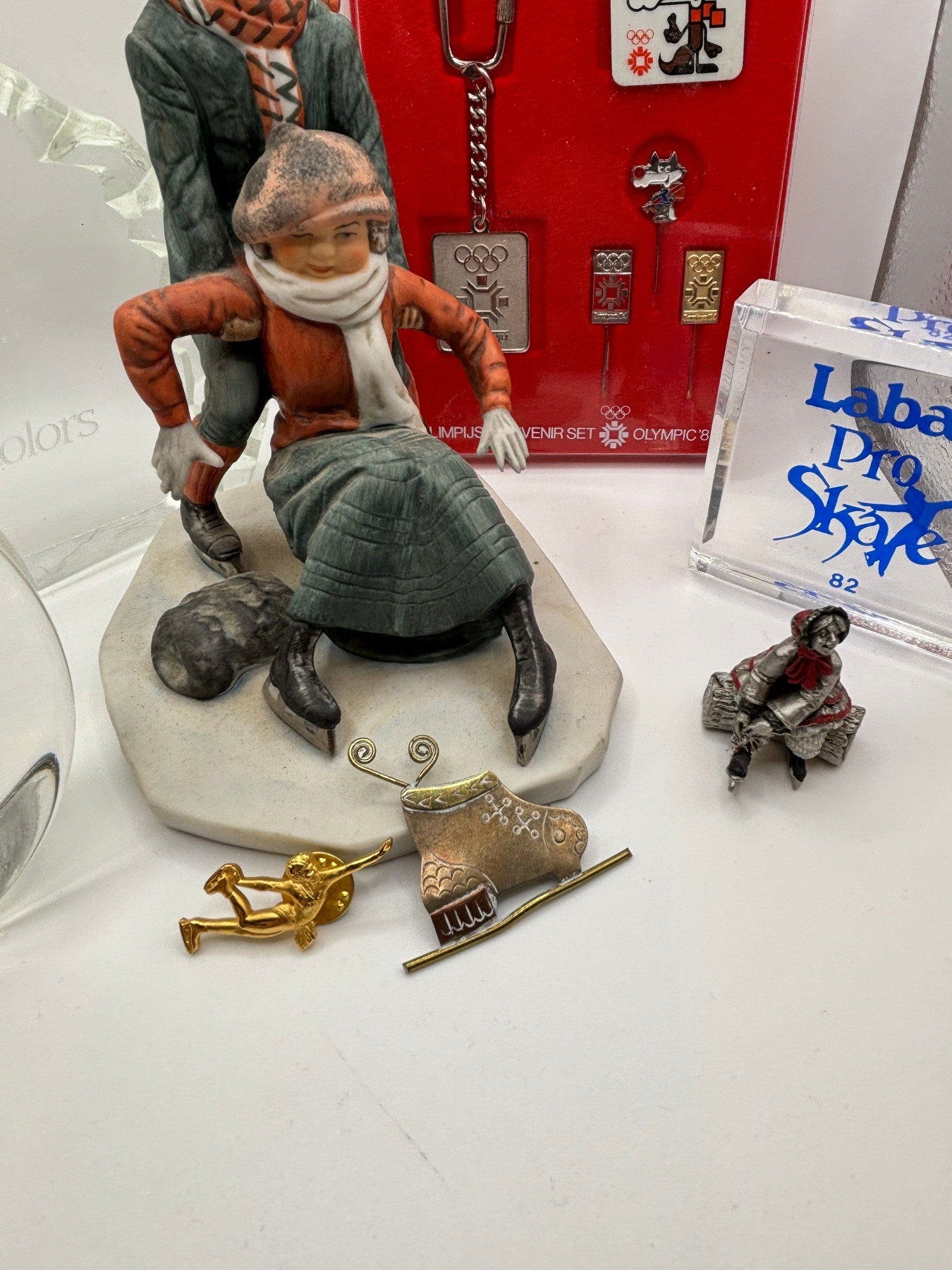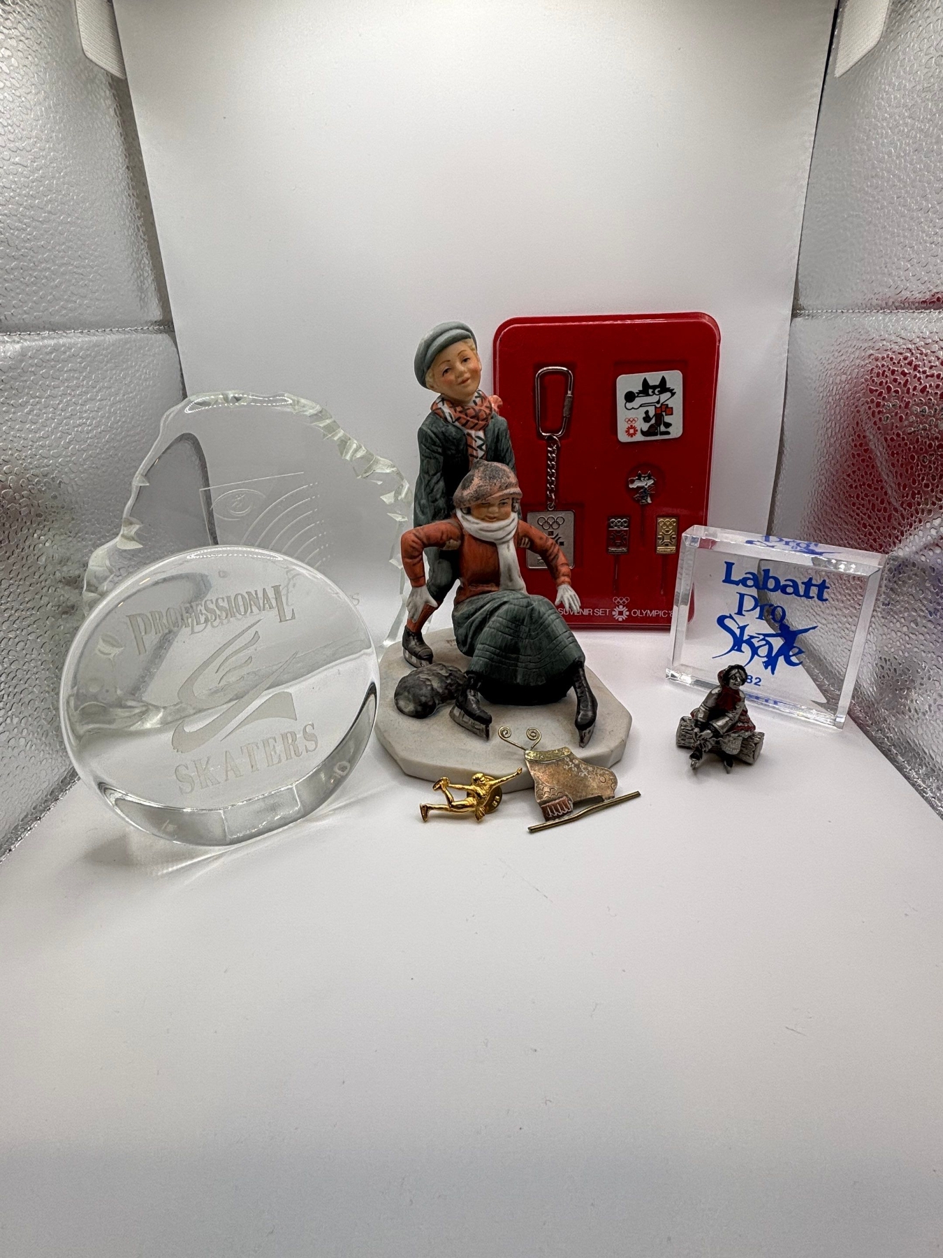skating collectables and 1984 Olympic souvenir set with a Labatt pro skate 82 and a sculpture inspired by the Norman Rockwell painting called skating N24