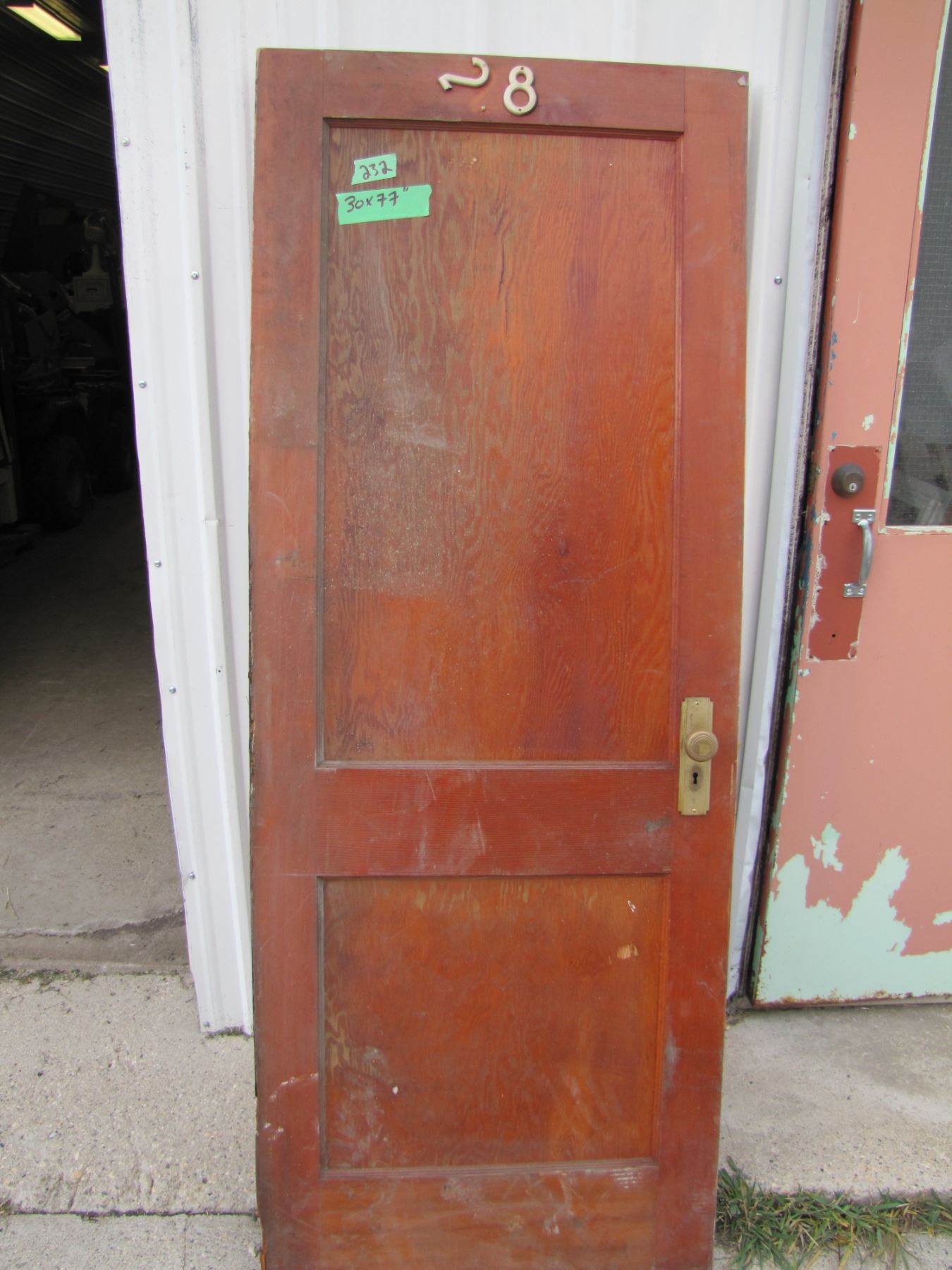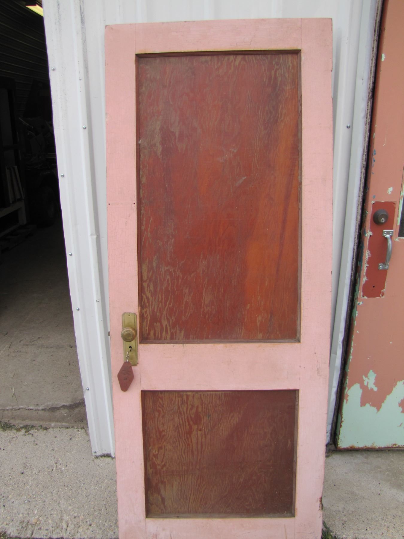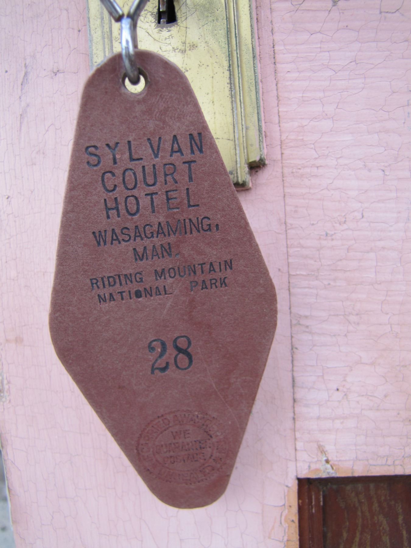 slab door has a bit of rot on one Edge, with key from the Sylvan Court hotel Wasagaming Manitoba, Riding Mountain National Park