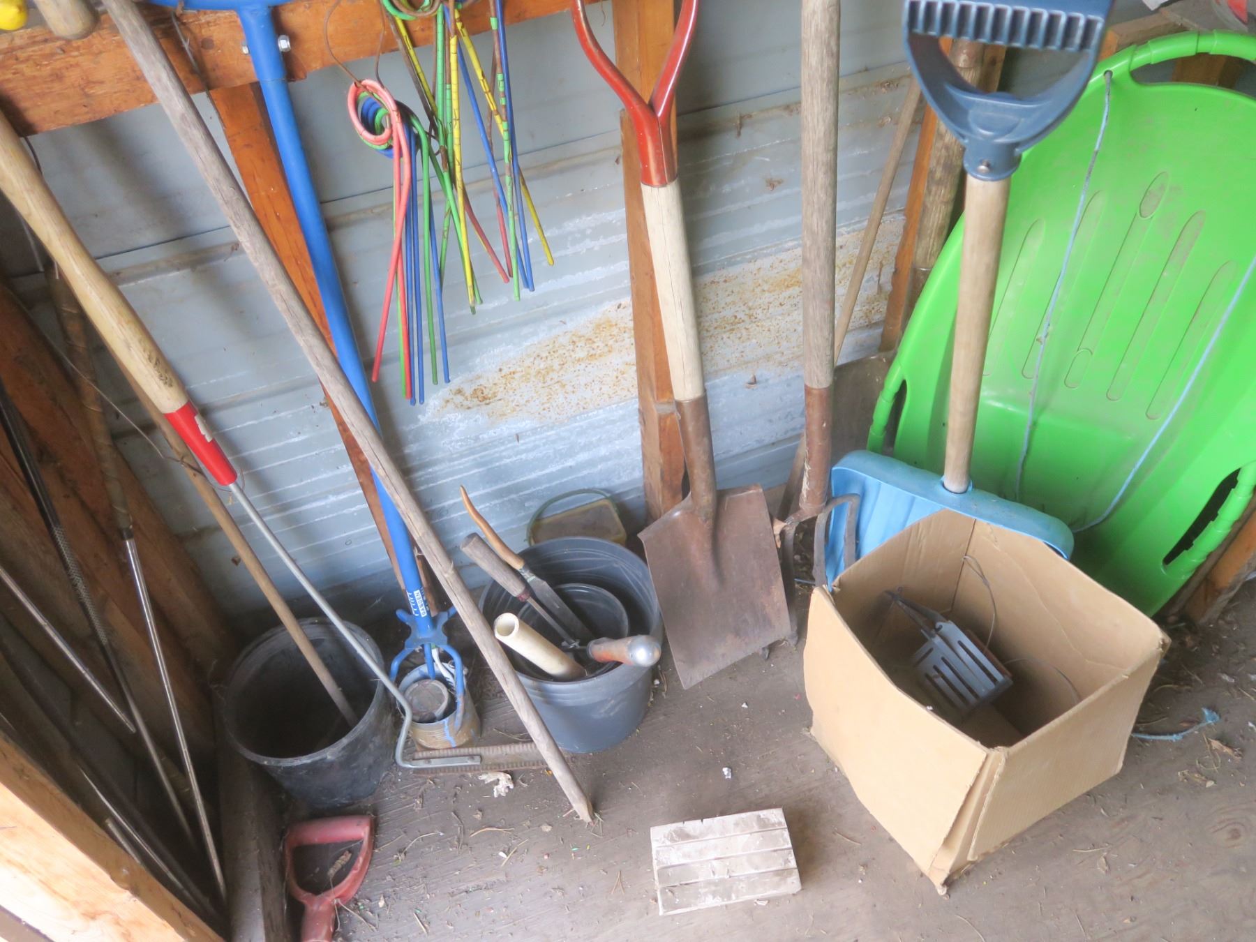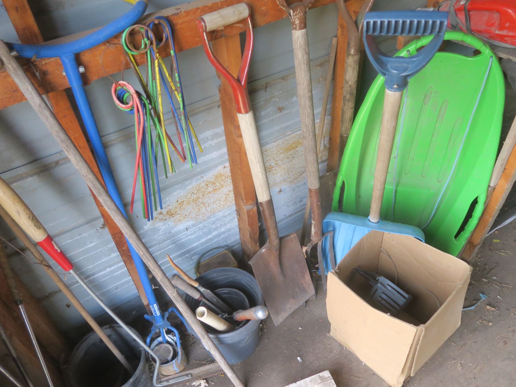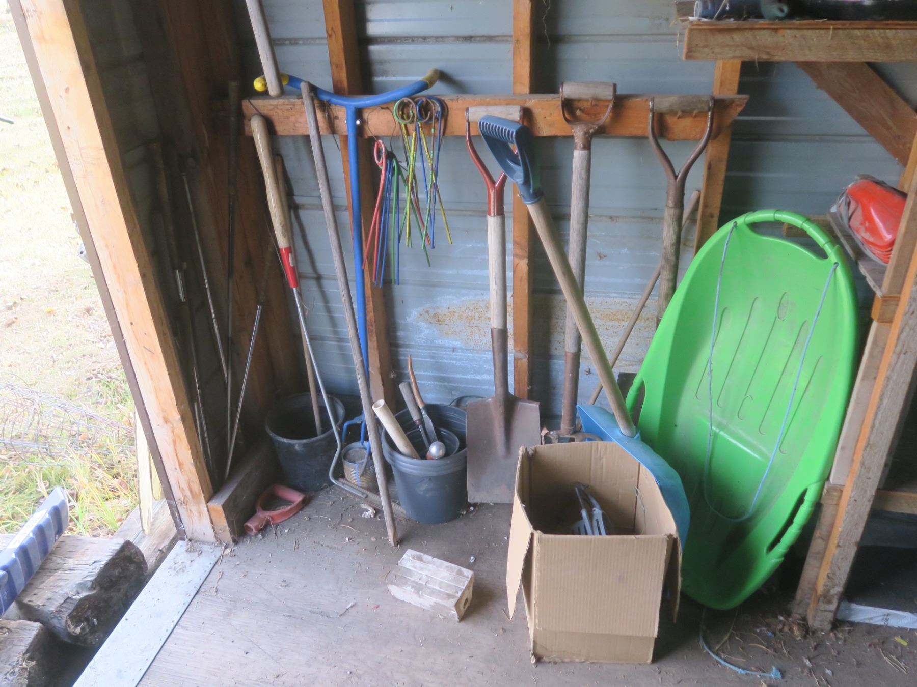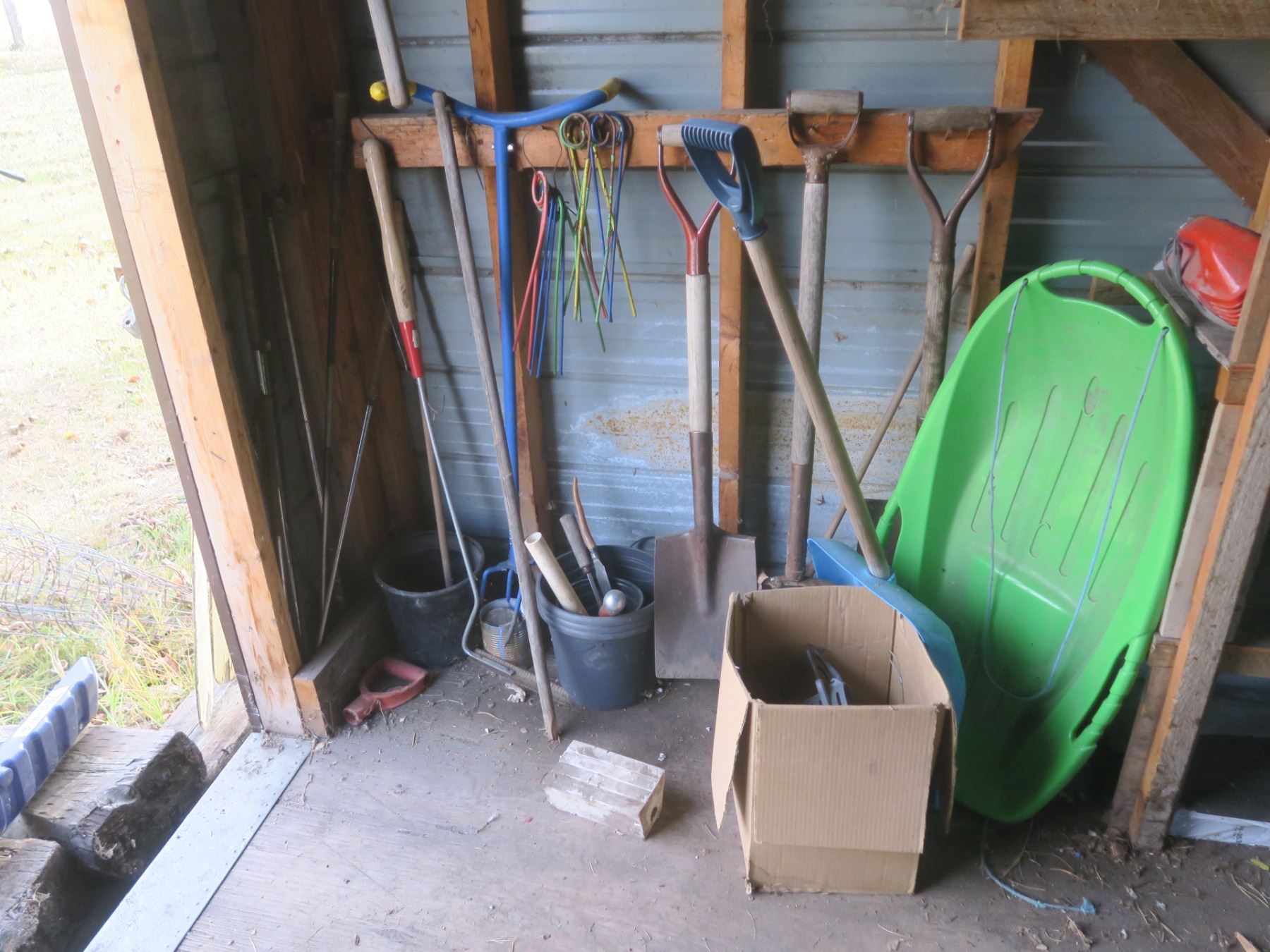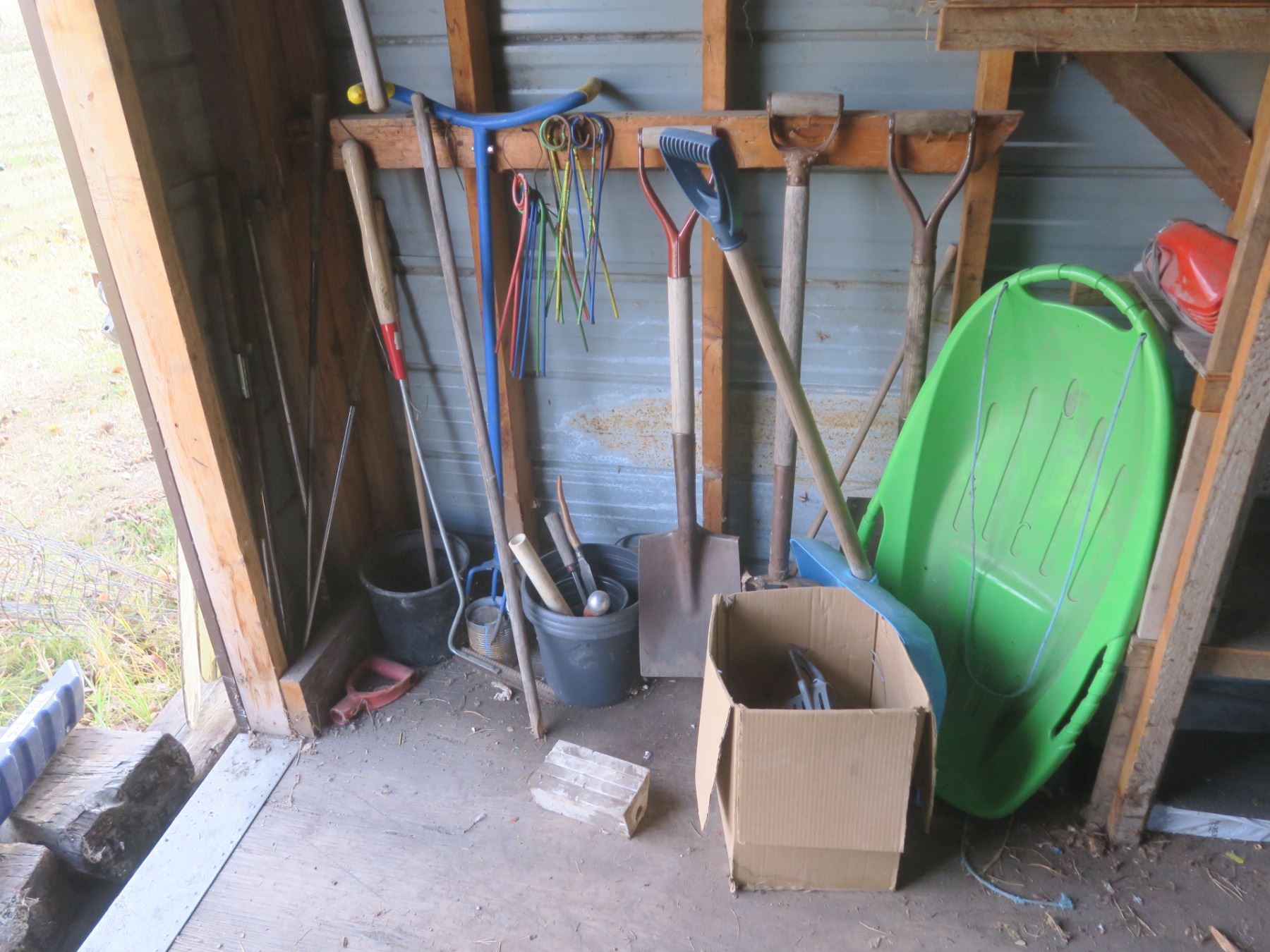 sled, shovels, pitch fork and misc
