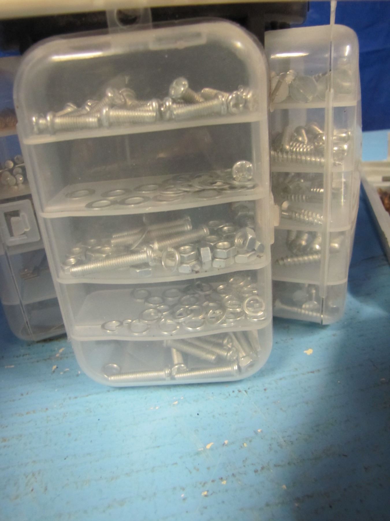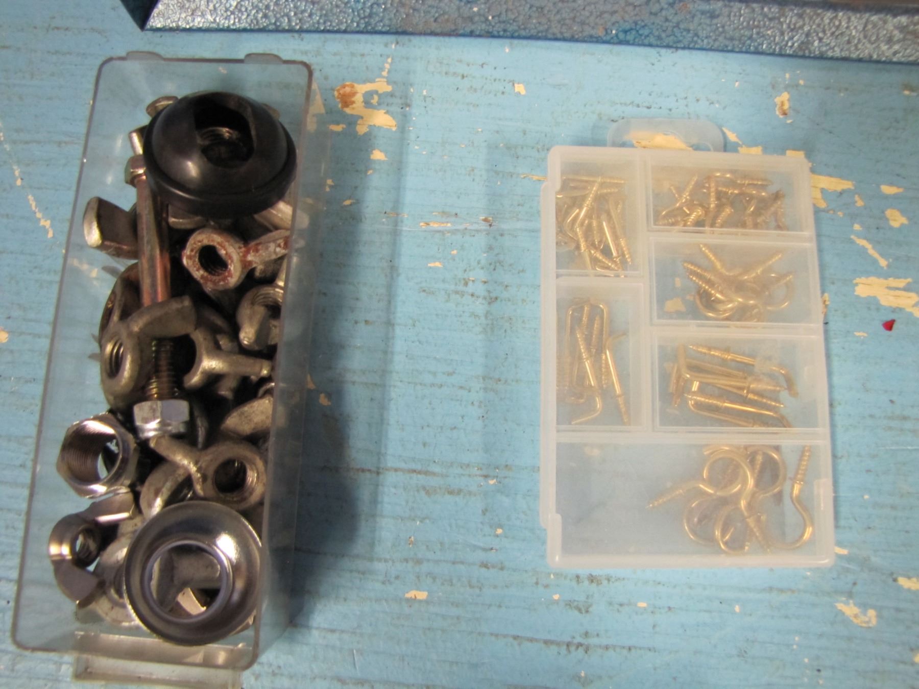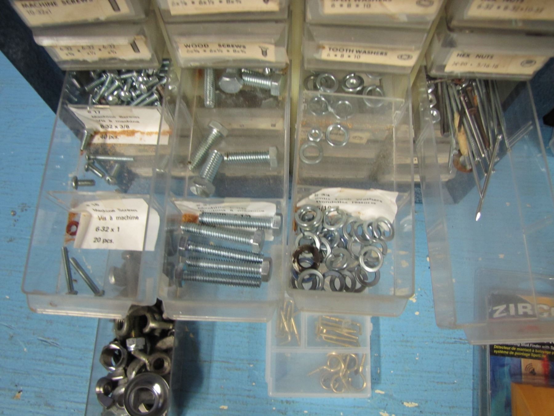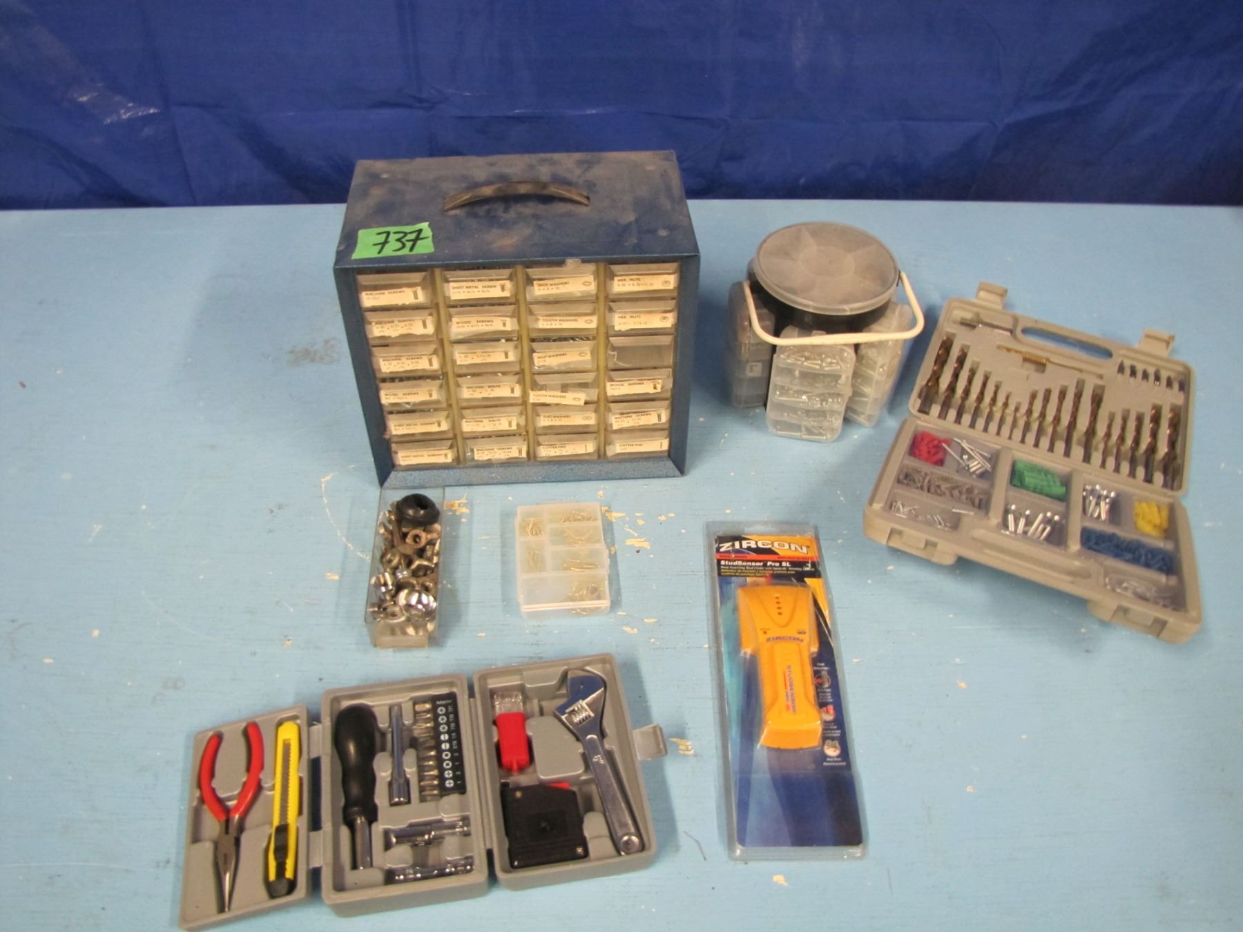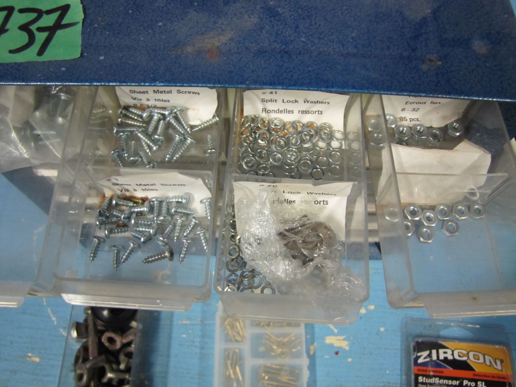 small cabinet with assorted Nuts and Bolts, stud finder, etcetera