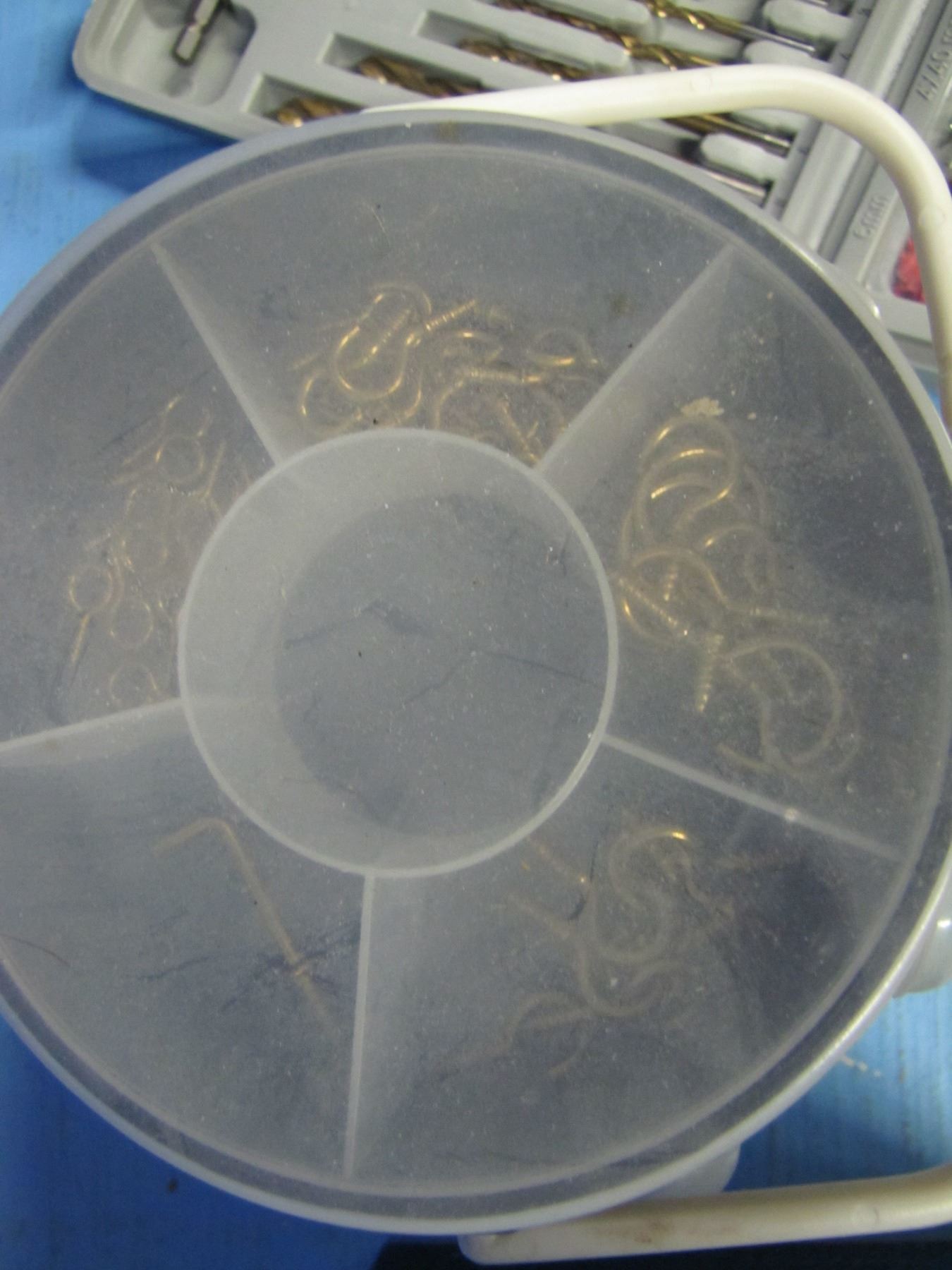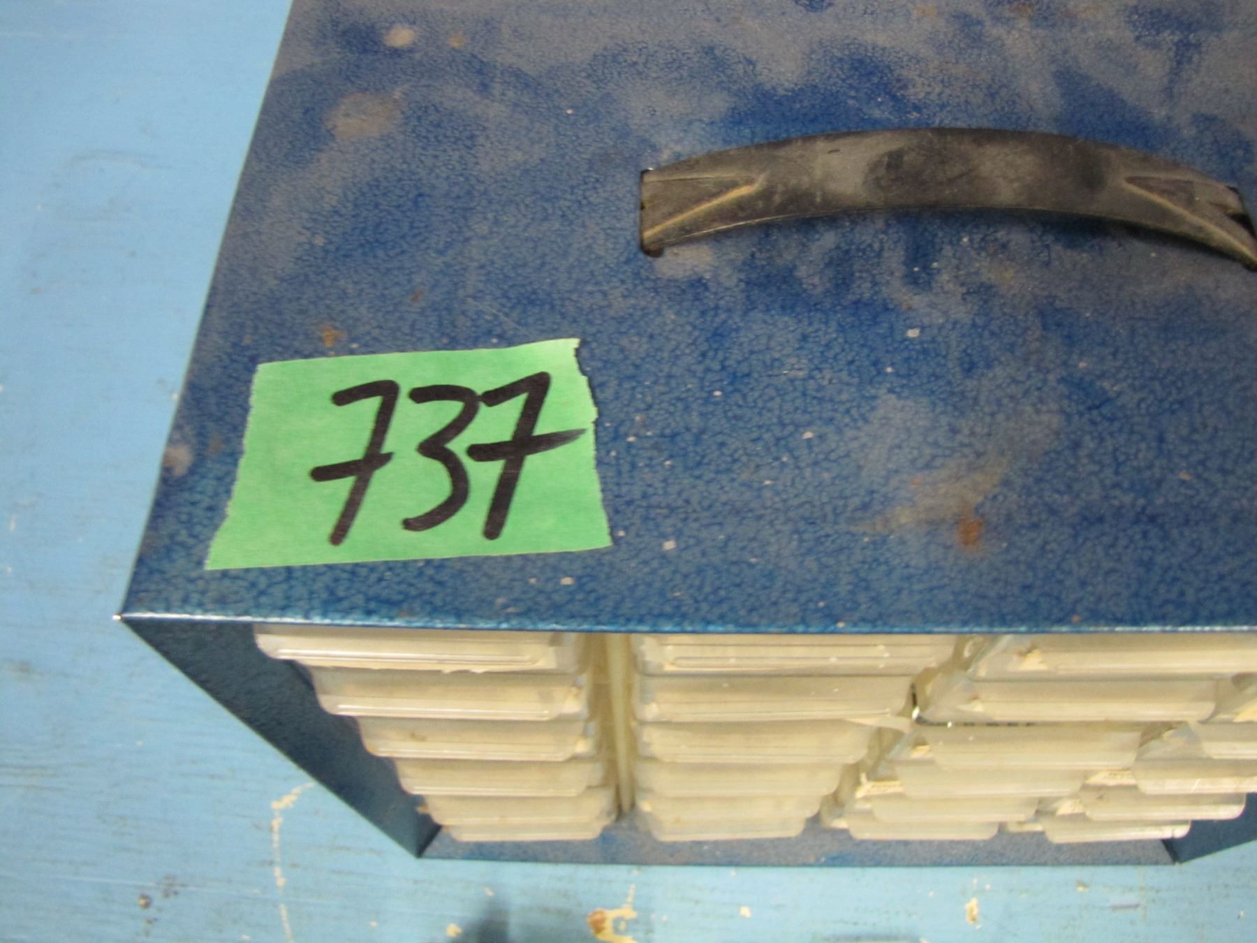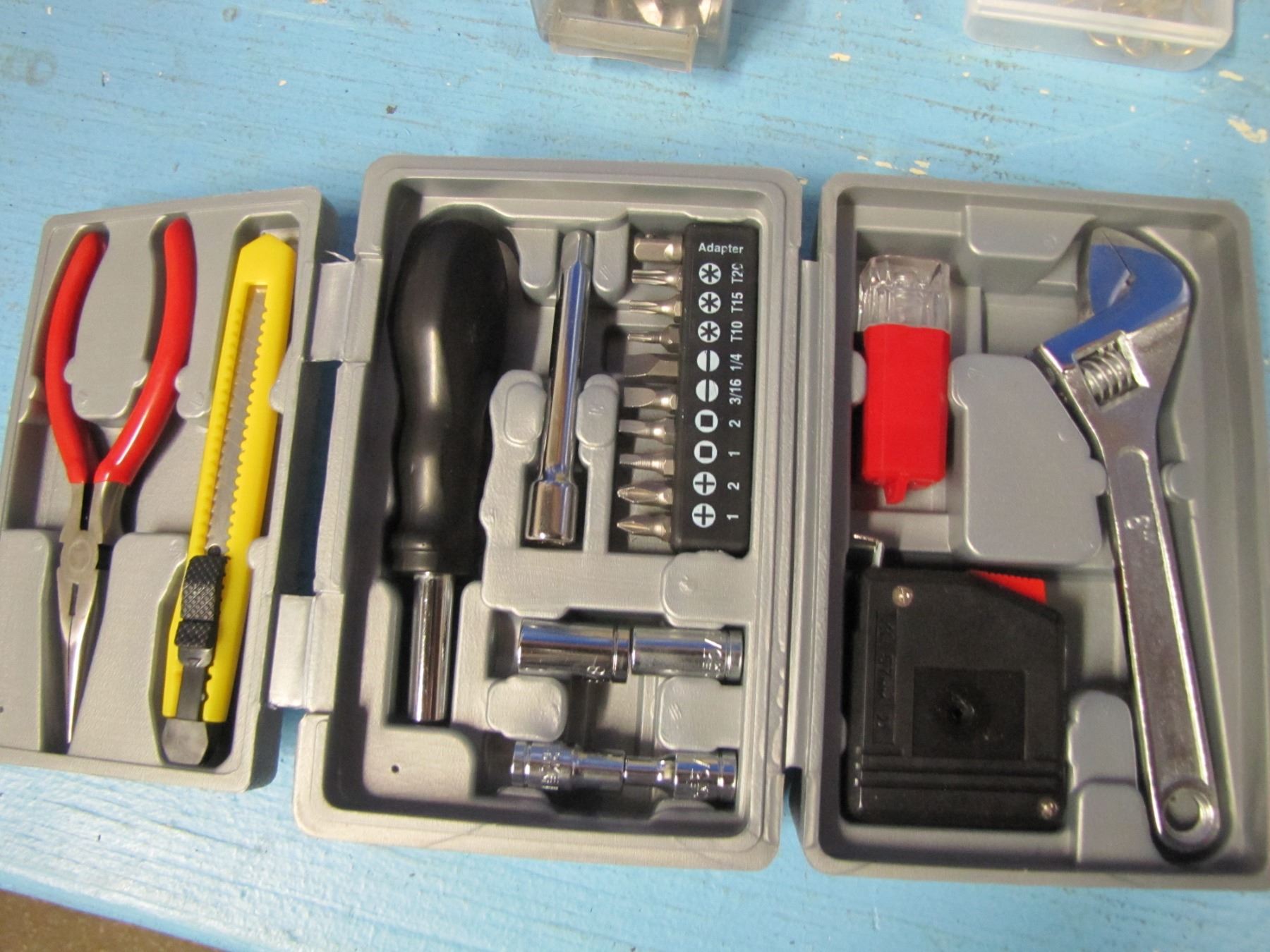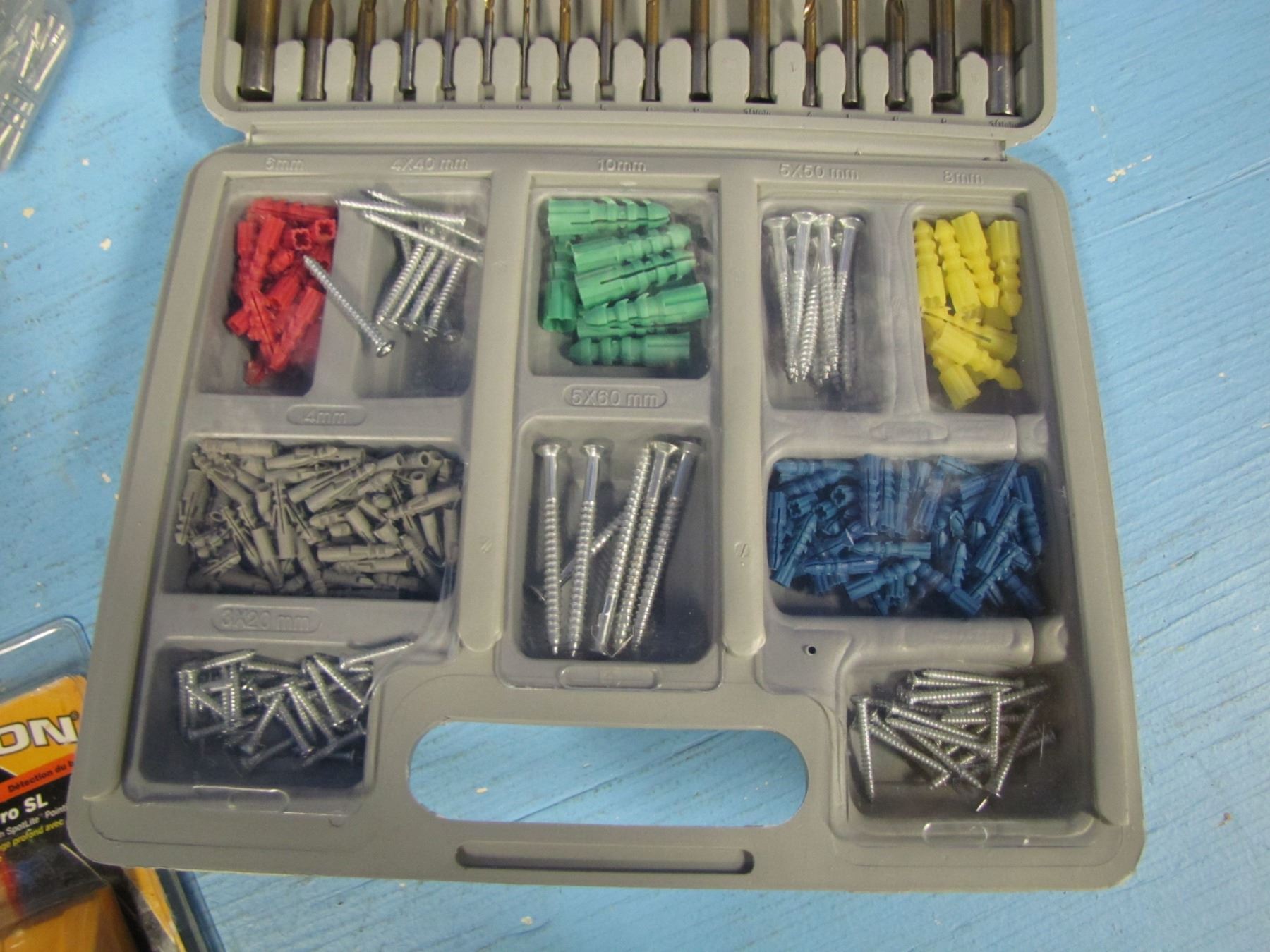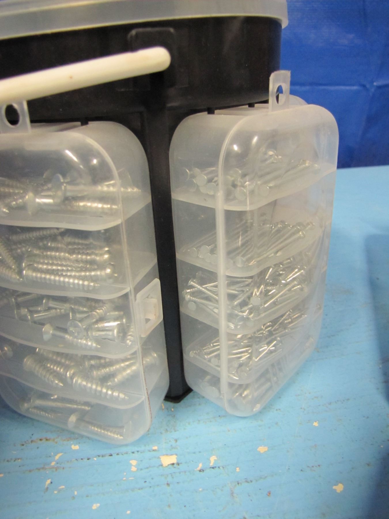 small cabinet with assorted Nuts and Bolts, stud finder, etcetera