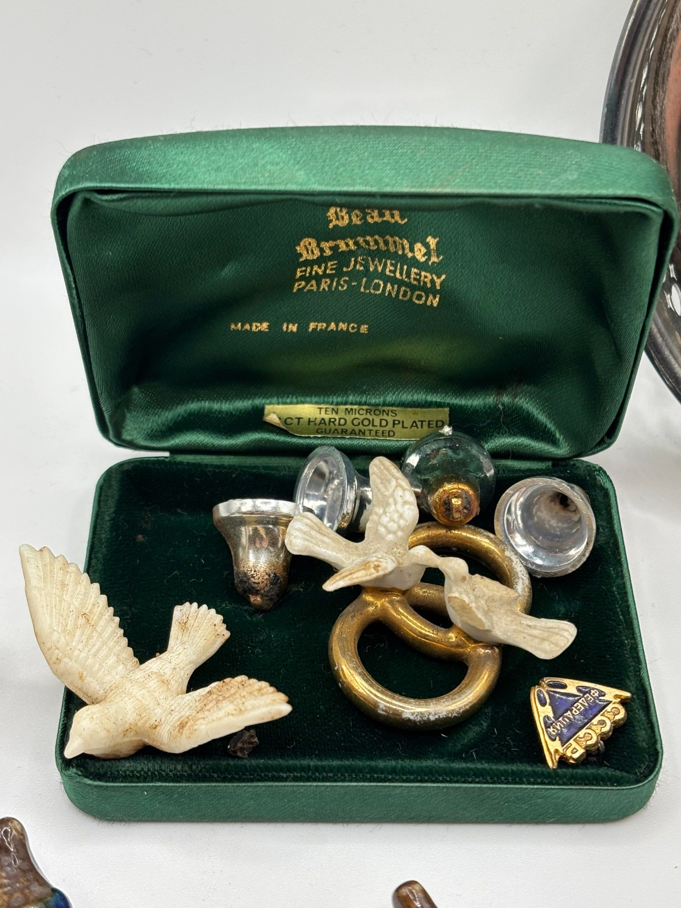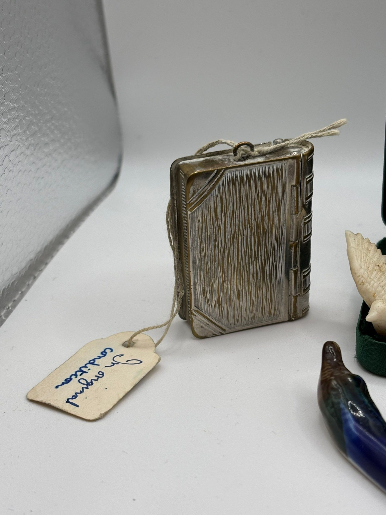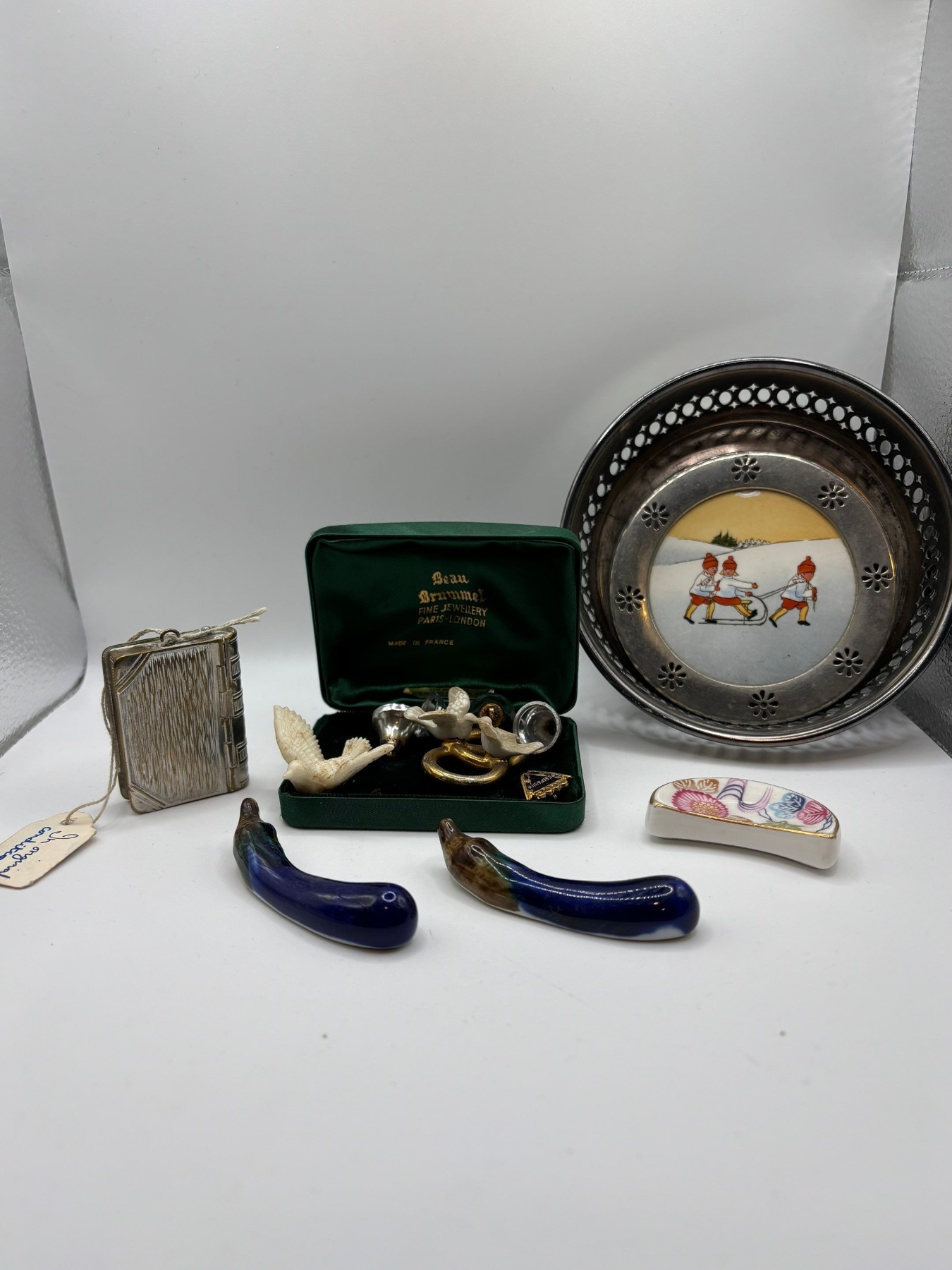 small ivory birds and a original make up powder case from the 1800s and silver plated bowl with two coasters n23
