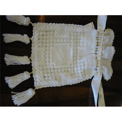 Lovely day bag, possibly used for wedding or church attire, made from hand embroidered linen with fringe on bottom .