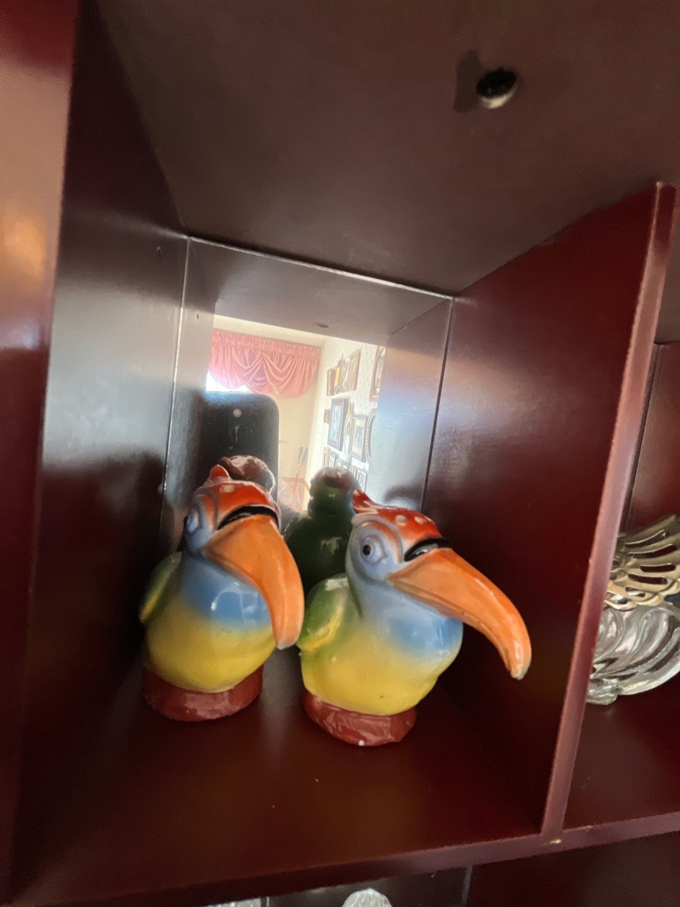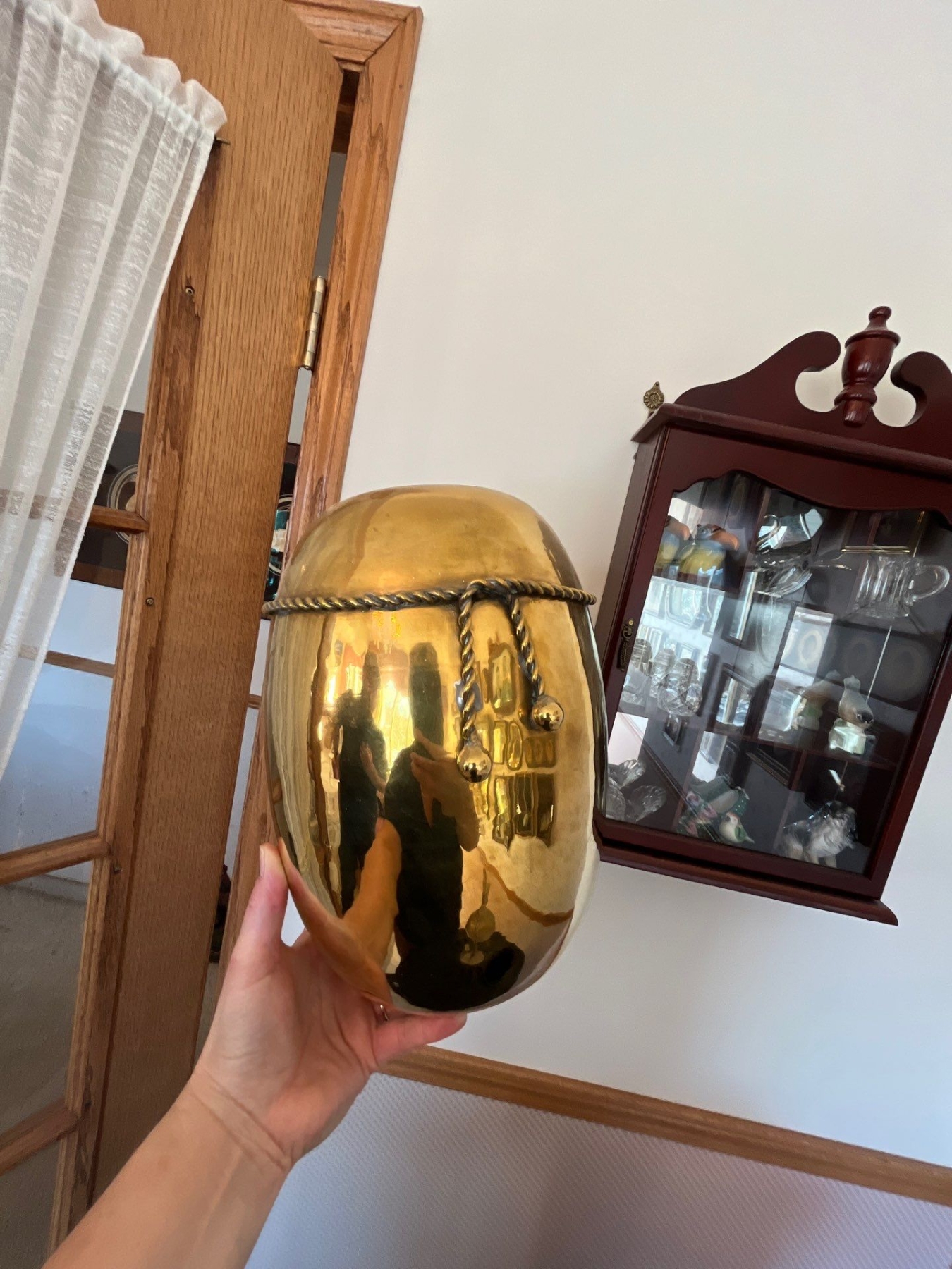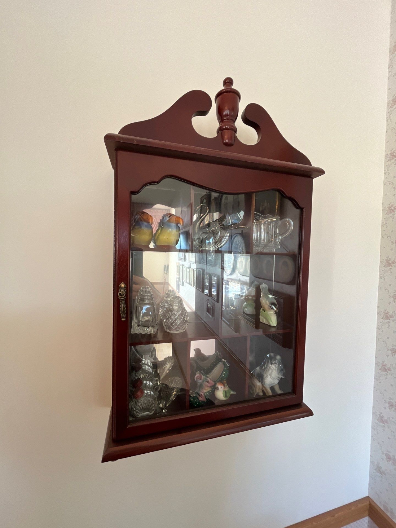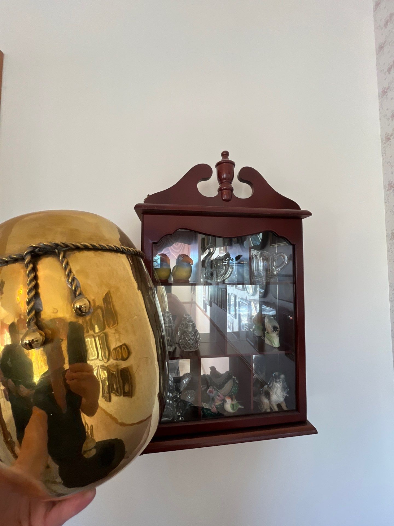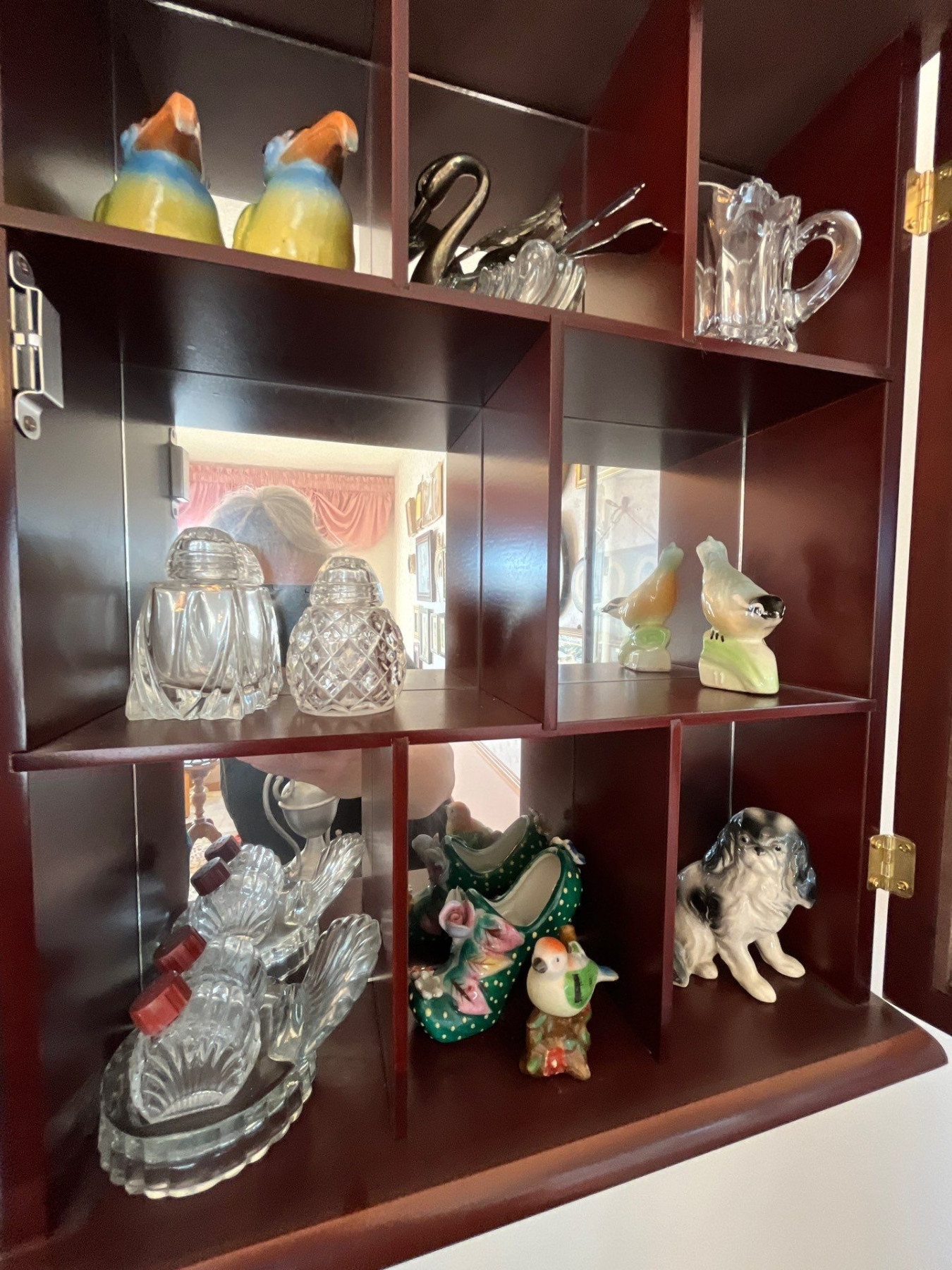 small wooden cabinet with collection of figurines and a brass spittoon .