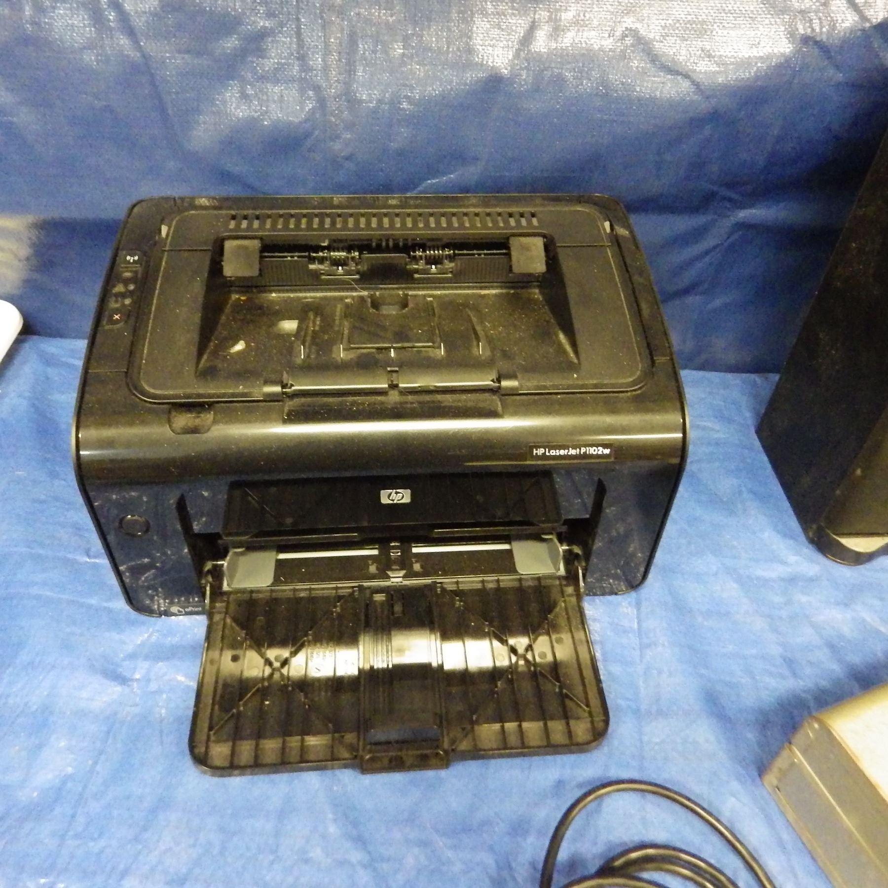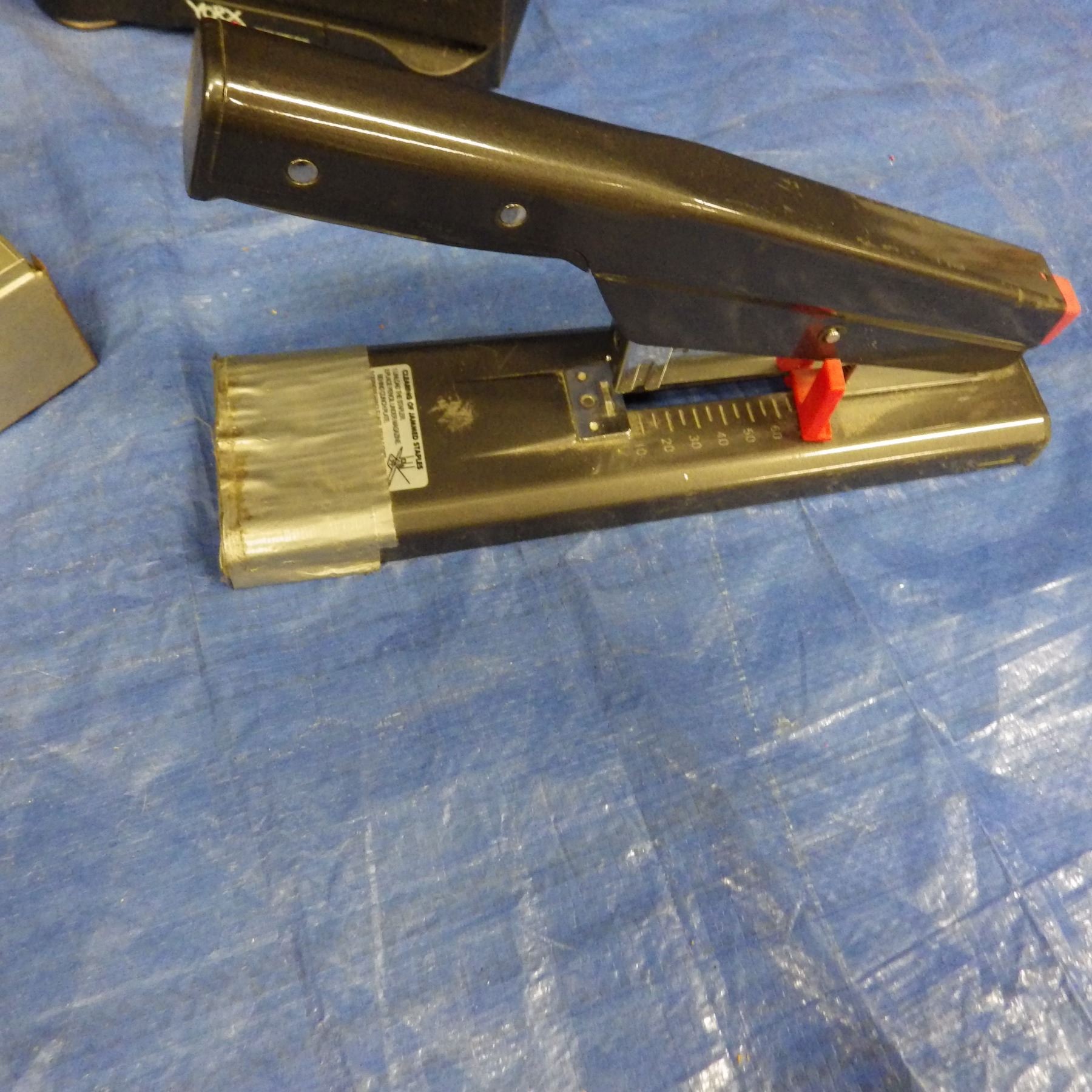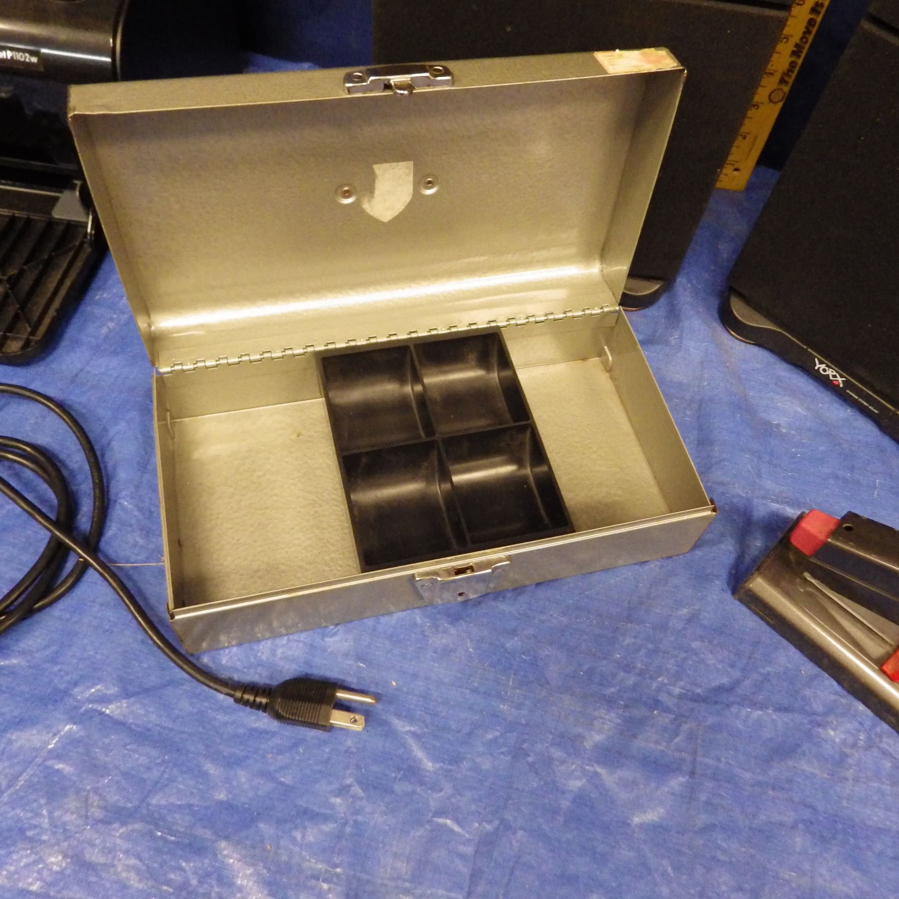 speakers, printer, cashbox, stapler