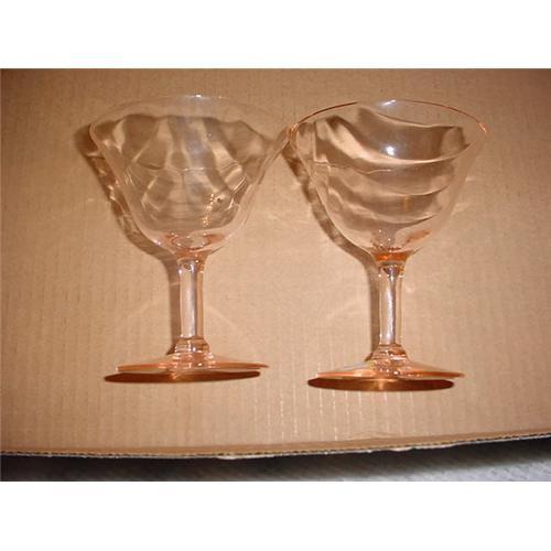Delicate pink dessert stemware with a wavy look to the glass, which is clear and light pink. They are in very good condition, with no nicks or blemishes. The stem section is 1-3/4". I have six available.