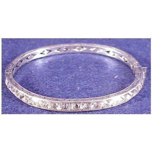 This is a marvelous example of a period antique bangle bracelet crafted in sterling silver with channel set square paste gems. Detailed and fine engraving is scrolled along the silver work of the entire band. The clasp is a tongue and groove closure. <P>Measuring 3/16" in width ( .04 cm) and will fit a wrist of 7 inches or less ( 2 1/4" x 2"). It is in excellent condition; hallmarked for "sterling" and date to circa 1925.