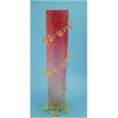 Outstanding Stevens & Williams Overshot vase with vaseline overlay glass that spirals from the top to the bottom. Also, there are five large tab feet that are also vaseline. (black light tested) This large vase, which is 12 1/2" tall is overshot glass. (you can request an article that I had written on overshot glass from me)The color of this vase is beautiful. It goes from a deep rich fuscia at the top and gradually shades to a pink at the bottom. Except for 1/4" piece of glass that is missing at the very tip of the tail (see photo) the vase is perfect. This is not unusual that these tips are missing, and it is not even noticeable. I only mention for accuracy of posting and this does not detract from the value of this piece at all. It is quite amazing that none of the protruding tabs or feet have any damage. The top is fire polished smooth. This piece is all hand blown and hand tooled.